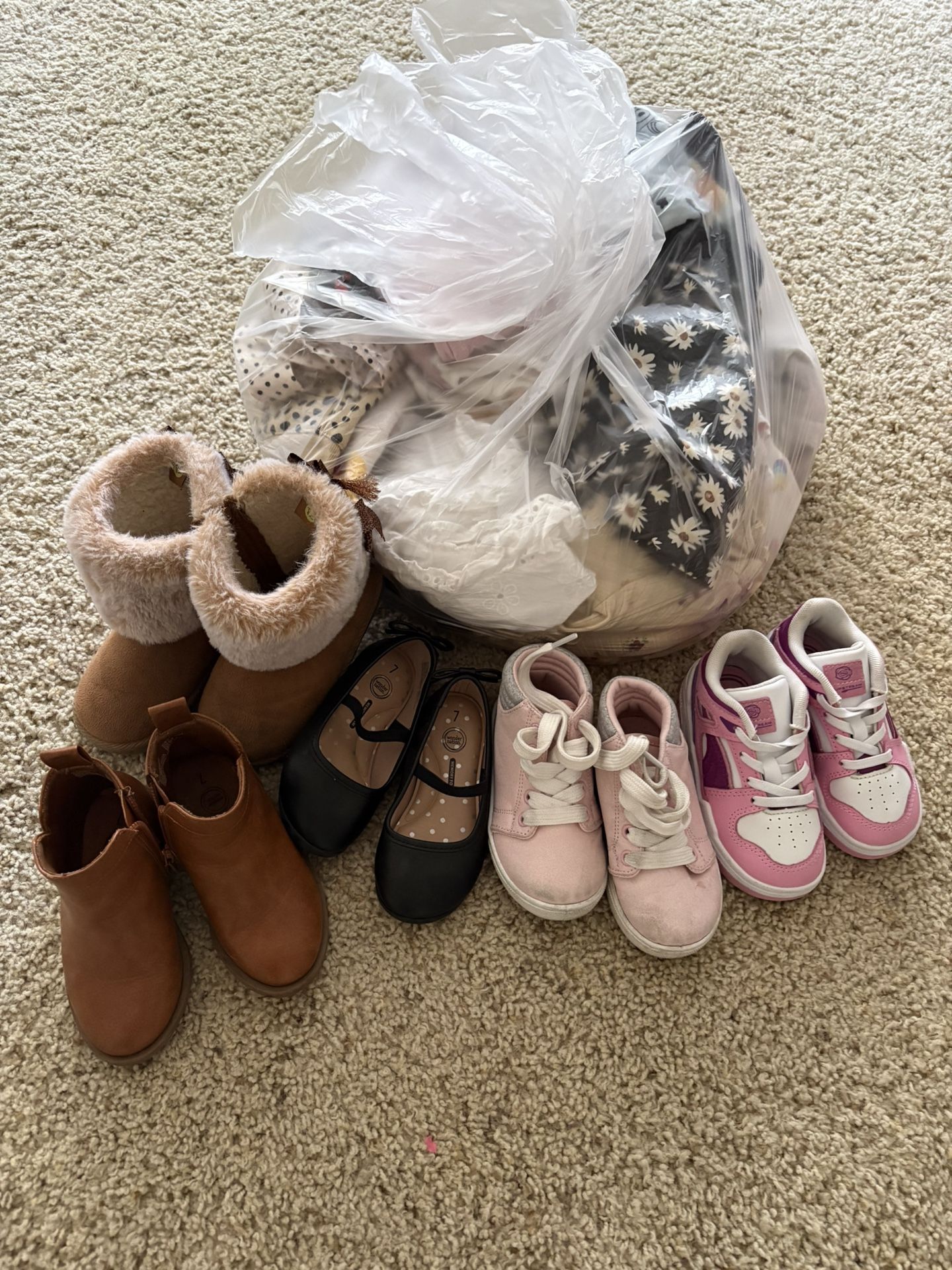 Mix of shirts ,sweaters,shoes (not including the pumas pink shoes ) dresses size 2T toddler girl