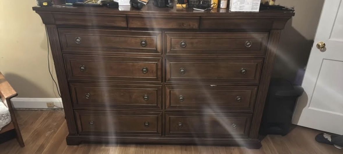 Bedroom set End table and dresser Dresser is 5 ft w 5 ft tall