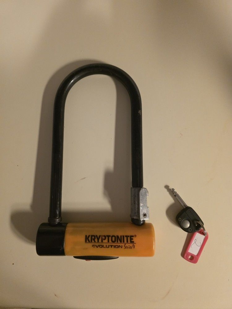 Lock it down with confidence. This Kryptonite Evolution Series 4 U-lock is a beast—designed for serious security in high-theft areas. Whether you're commuting, storing your bike overnight, or locking up gear, this lock delivers top-tier protection. Details: - Includes 1 original key (as shown) - Heavy-duty 13mm hardened steel shackle - Smooth locking mechanism, excellent condition - Ideal for bikes, scooters, gates, or gear - Retails for $75+ new—yours for just $40 Why it’s a steal: This isn’t your average lock—it’s a Level 7 security-rated Kryptonite built to resist bolt cutters, leverage attacks, and tampering. Trusted by urban cyclists and gearheads alike, it’s the kind of lock that makes thieves walk away.