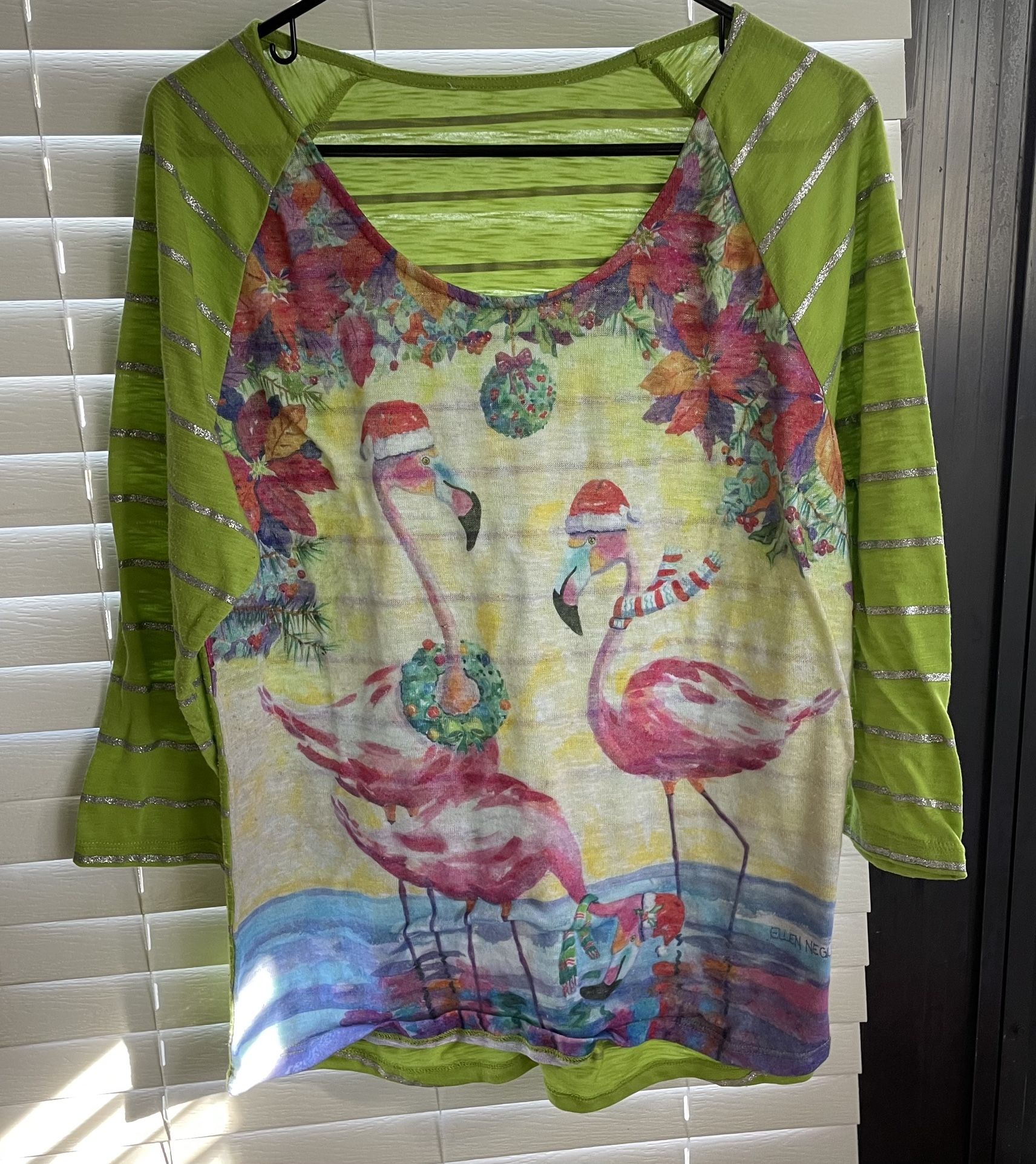 *** There is NO SIZE tag. Length (top seam to hem) - 28.5” Width (armpit to armpit) - 22” Sleeve Length (natural shoulder to hem of sleeve) - 19.75” Hem Line (side seam to side seam) - 24” This Christmas-themed Ellen Negley shirt in size Large features a lime green color with an eye-catching print of Christmas flamingos, making it a fun and festive option for a Christmas party. The shirt has a round neckline, 3/4 sleeves, and a relaxed fit, providing a comfortable and lightweight wear. Made of 100% polyester, it is machine washable and suitable for the winter season. The graphic print and animal pattern add a playful touch to this jersey-style blouse, perfect for celebrating the holiday season with a unique flair.
