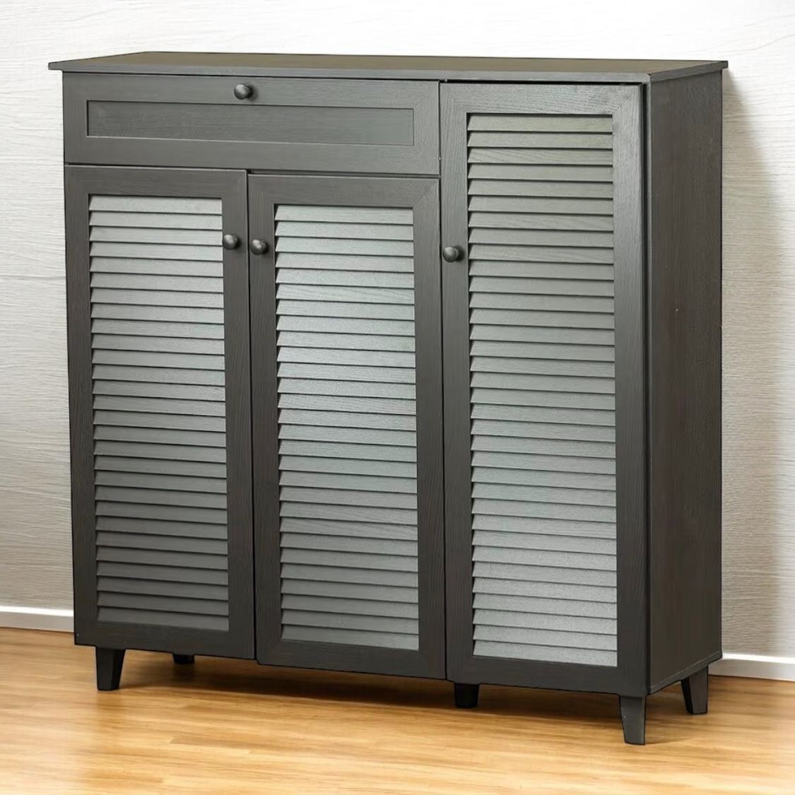 New Gray Shoe Storage Organizer Cabinet * Dimensions: 45.25" W x 45.25" H x 14.50" D * Hinged front doors with Solid wood handles * 5 fixed-height shelves for shoe storage and top drawer provide extra storage * Fully Assembled * Trusted Seller / Read/ See My Reviews! Follow Me For Amazing Deals Listed Daily