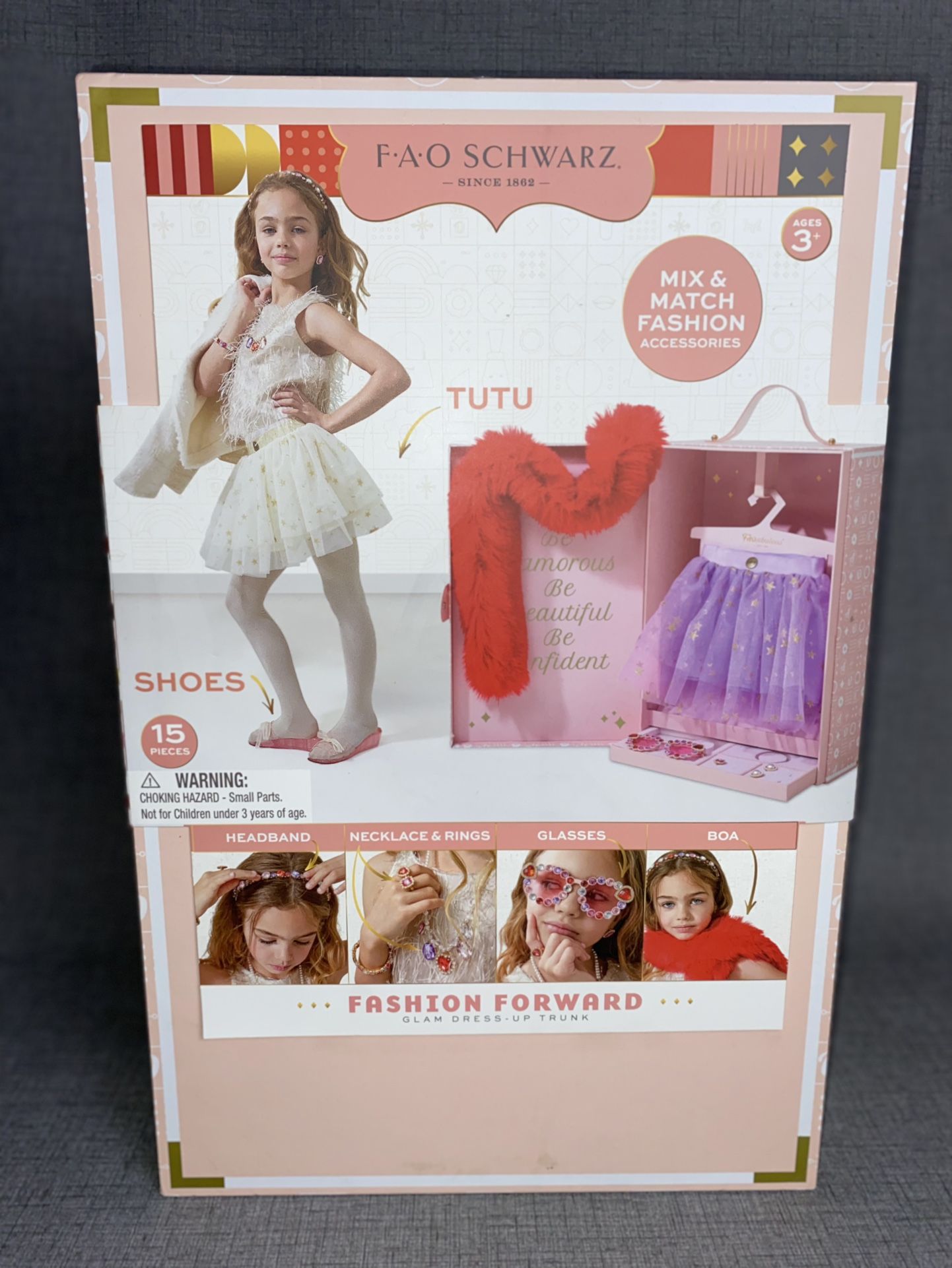 New. Originally 70$ Dive into the world of glitz and glam with this comprehensive dress-up trunk. • Create fabulous outfits with multiple mix-and-match accessory options. • Sturdy fashion organizer trunk provides perfect storage with hangers and drawers. • 15-piece set offers a range of fashion-forward pieces for endless creativity. • Perfect for children aged 3 and up dreaming of the spotlight. • F.A.O. Schwarz®, celebrating the wonder of childhood since 1862