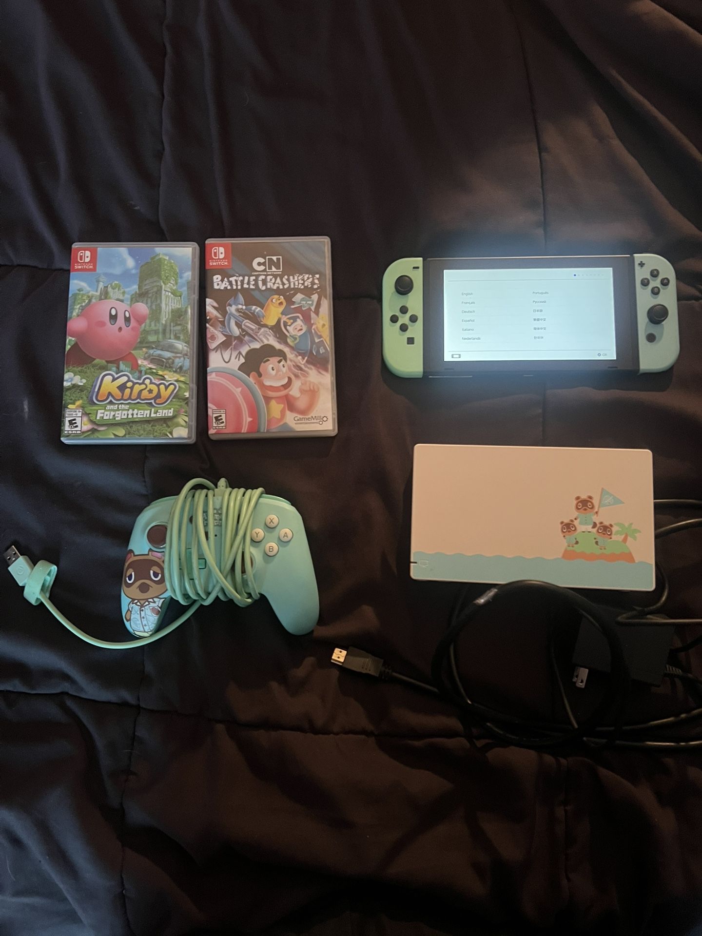 Selling my barely used Factory Reseted Nintendo Switch Animal Crossing Edition. “Doesn’t include the Animal Crossing Game” but does include everything in the picture. Picture Includes • 2 Games, Kirby and the Forgotten Land & Cartoon Network Battle Crashers. • Animal Crossing Themed TV Dock. • Animal Crossing Themed Switch Controller. • HDMI & Power Cords.