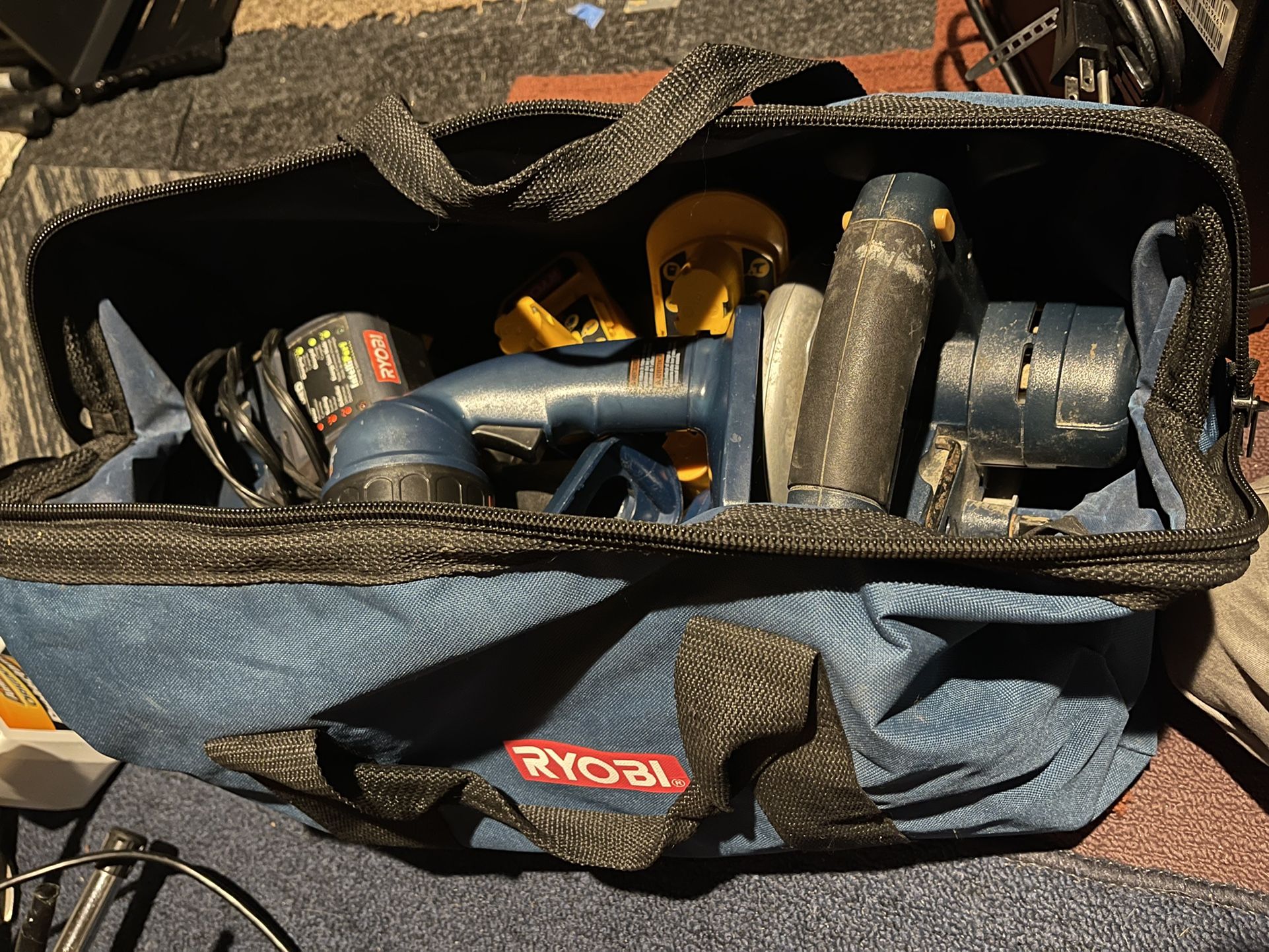 Ryobi 18 volts 6 piece tools kit with 2 chargers 4 batteries, 1 brand new battery and tool case. Has 2 blades 1 for circular saw 1 for reciprocal saw. 2 drills, sander, flashlight. Everything works great and 1 battery is brand new others have various levels of charge left so I bought a brand new battery which lasts long time. Charges pretty quick too. Great full kit for handyman or homeowner.