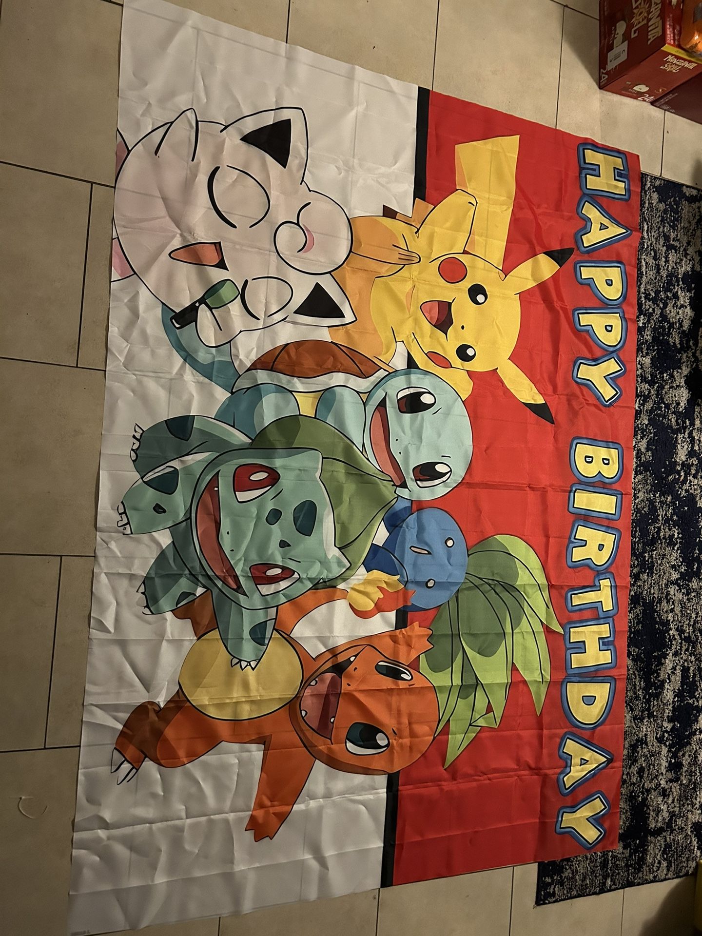 Selling everything you would need for a Pokémon first birthday! New! Nephews birthday got canceled due to the rain and now cannot return. Pikachu piñata- 3ft tall -$30 Happy birthday banner 5ft x almost 7ft -$12 Pokémon ball for round back drop 7.2ft (standard round) - $25 5 Pokémon runners-$15 8 Pokémon centerpieces -$20 1- larger cardboard 4ft number 1 that lights up -$20 6 Pokémon ball flags -$3 48pc slap bracelets for goodie bags or Pinata stuffers- $6 12 Spike balls for Pinata -$10 36pc mini pelon -$9 12 squishy pikachus - $15 225 pica freshas new never opened -$10