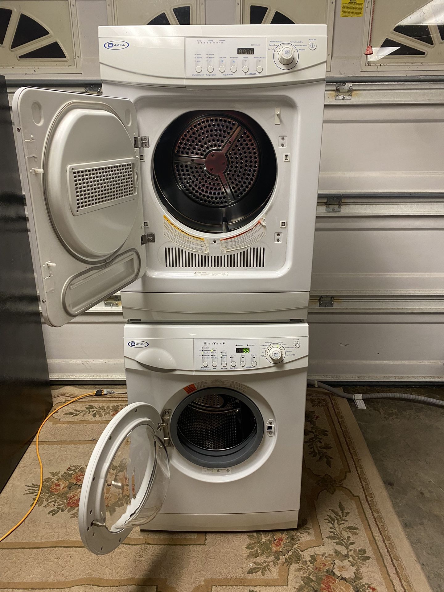 Have an amazing Maytag stackable washer and dryer set. This set is in immaculate condition and so well taken care of as the pictures show. Washer is spotless and runs perfect. Dryer is also spotless and runs perfect. Washer has all water hoses and drain hose. Dryer has power cord but needs dryer vent hose. This set has barely been used, we have a full size W/D set now - sad to see this go. It’s a Maytag - both will run forever and in like new condition. Washer 23.75 wide 33.25 tall 25.2 deep Dryer 23.75 wide 33.5 tall 23.75 deep