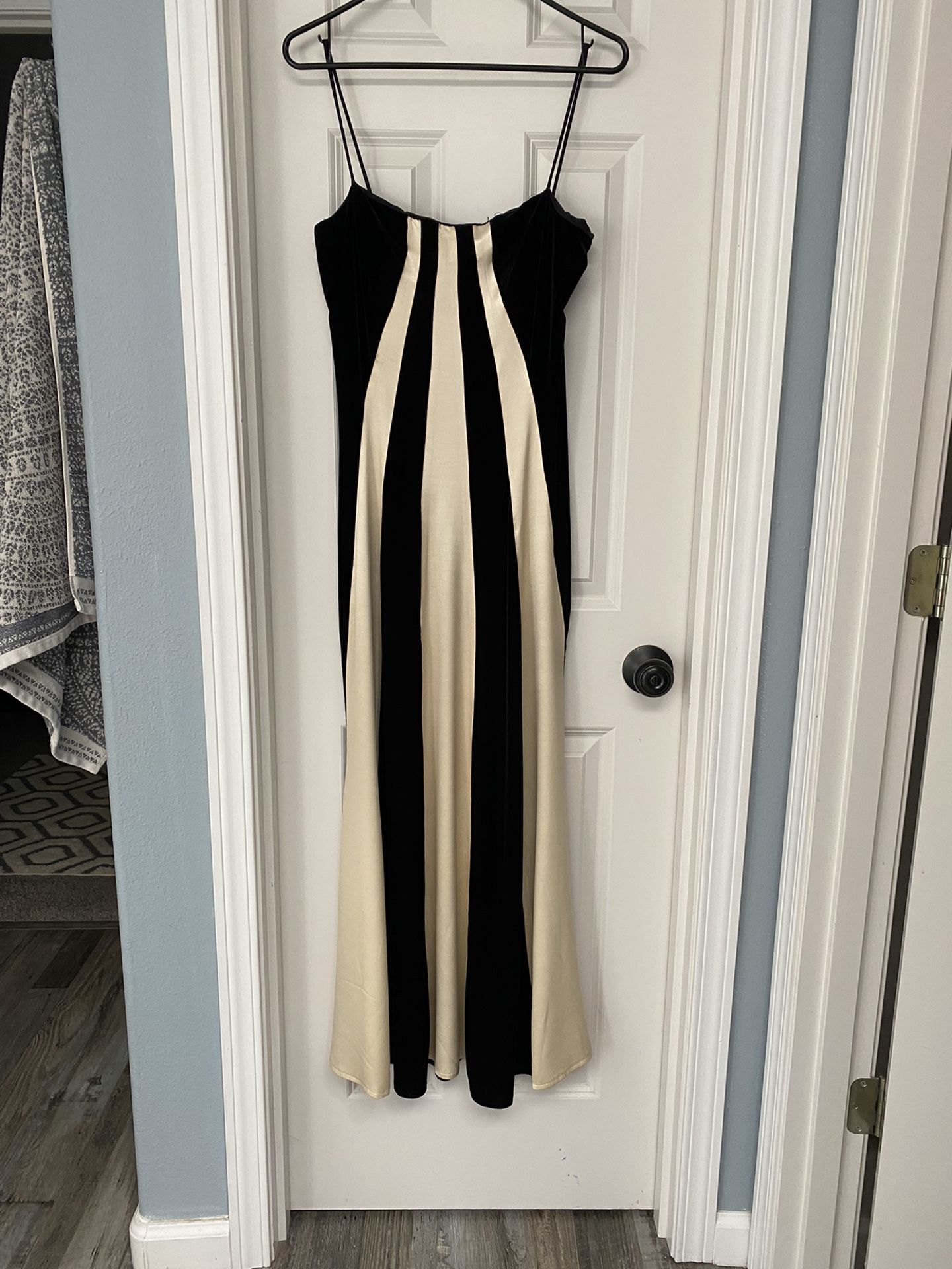 Incredible black and cream velvet vintage gown, fits around size 6. Perfect for your Halloween costume this year!!! Circus, Alice in Wonderland, Queen of Hearts, Gatsby, Cruella Deville, Ursula…. black and White ball…. Options are endless!! Looks gorgeous on!!