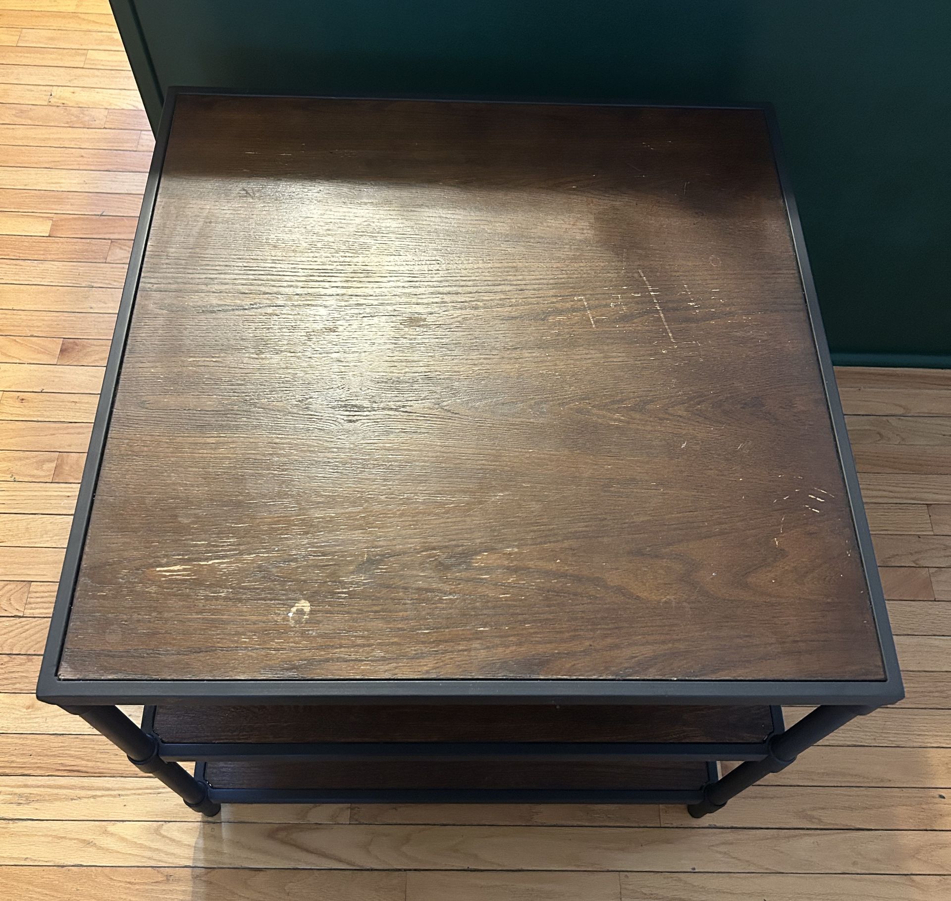 20$ OBO Sturdy wood coffee table with black metal frame and two lower shelves for storage. Works well in a living room, family room, or basement. The industrial/modern style fits a lot of spaces. There is visible surface wear and light scratching on the top (see photos), but it’s solid and functional with no wobble. Great for everyday use or a DIY/refinish project. Dimensions: 28” L x 28” W x 25” H From a smoke-free home.
