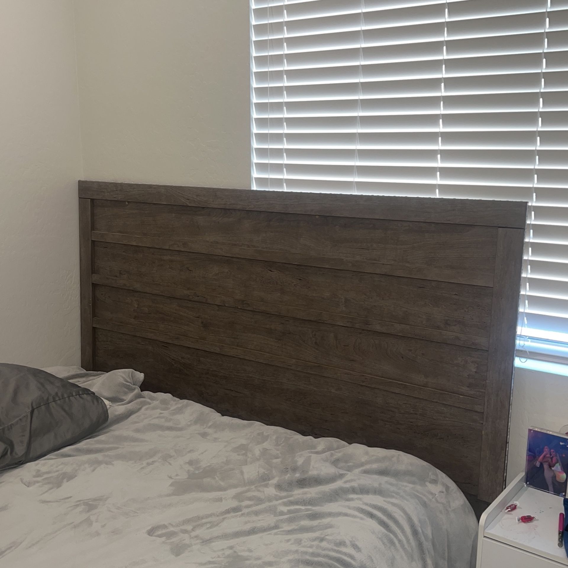 Queen sized headboard, greyish color. Just selling bc it doesn’t fit my theme anymore. It has led strip around it just needs the connector cable! And the drill holds were made bc we needed extra support and drilled in the wall.