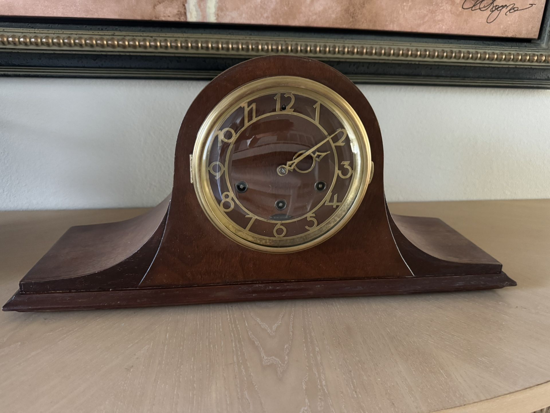Solid brass bezel, hands, and numbers and original key. The finish on it is called provincial and it’s in perfect condition. The inside of the clock simply needs to be cleaned. It ticks for a little while but stops and we’ve heard it chime on occasion as well, but it does need to be cleaned. Selling for half of what it’s actually worth because we have two hump back clocks and we don’t need two. 😉
