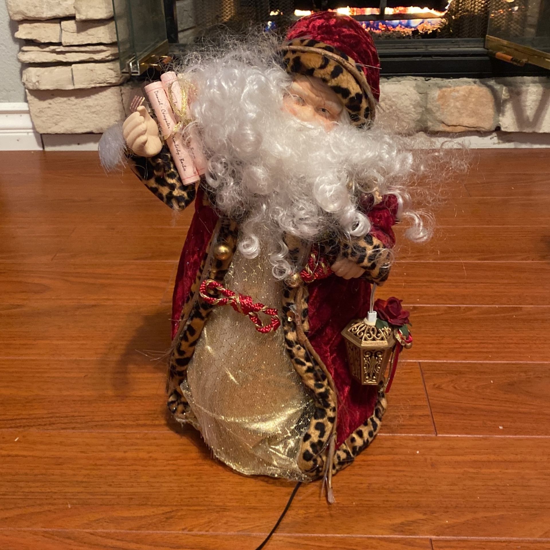 Santa tree topper with leopard trim. Used. Has crack in porcelain face. Potential to have the lantern light up on tree.