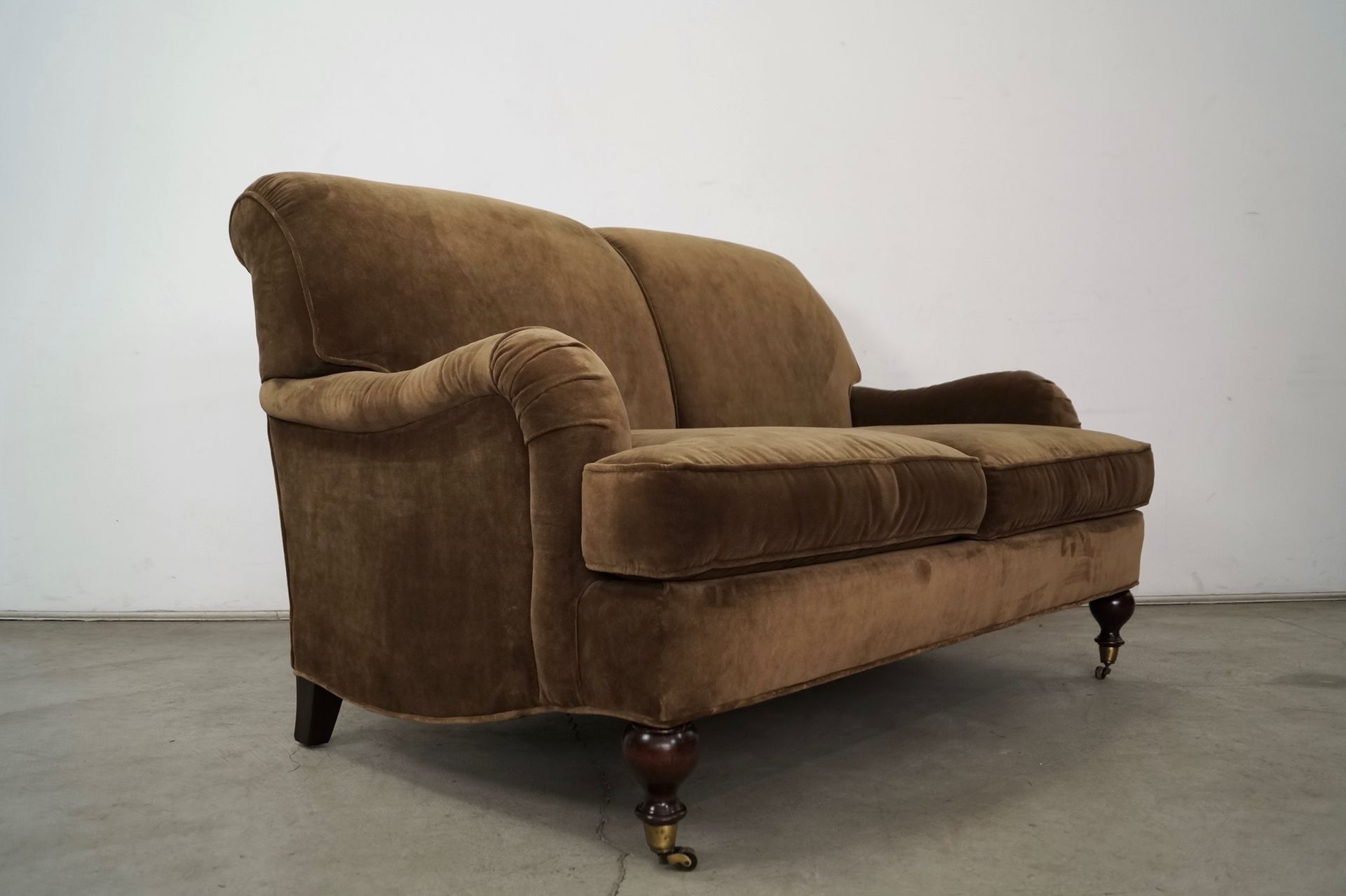 Hollywood Regency loveseat couch for sale. Really well made, and manufactured here in the US. It has a solid frame with coil springs on the seat, and springs on the back. It's a deep rich brown velvet, and is in great condition. It has two legs in the front with brass caps and casters, and two angled back legs in a dark walnut finish. It has a classic English arm roll design in the manner of George Smith designs. Great size sofa, and very comfortable. The measurements are 57" long x 35" tall x 39 1/2" deep x 19 1/4" seat height. Delivery can be arranged. Please check my other listings! π Mcm mid century art deco