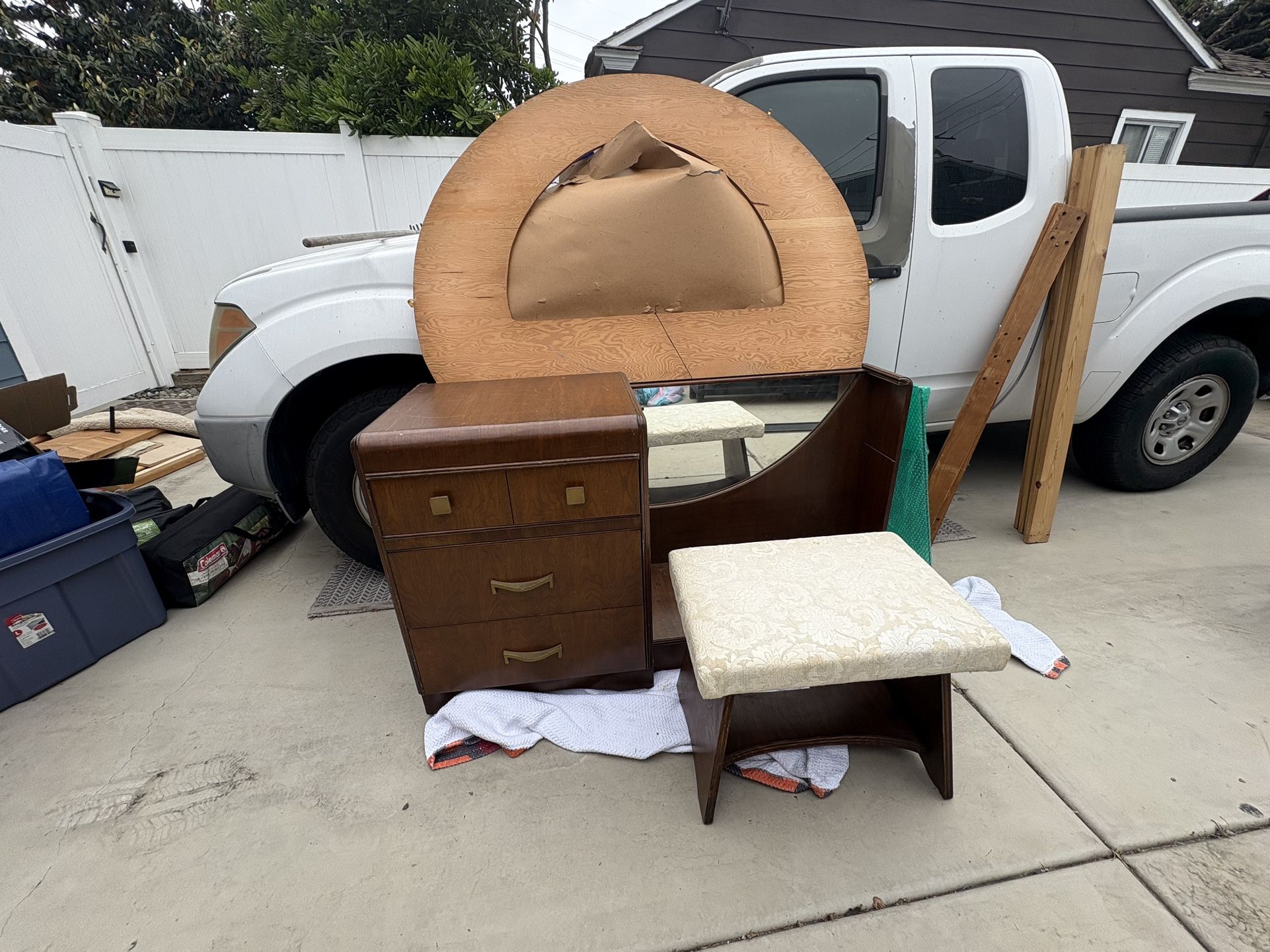 A vintage mid century modern vanity with matching stool. There should be a large half circle mirror to complete the look but that broke. The vanity still works but it is missing the top mirror. Normal wear and tear for a piece of furniture this old. See pictures for further details.