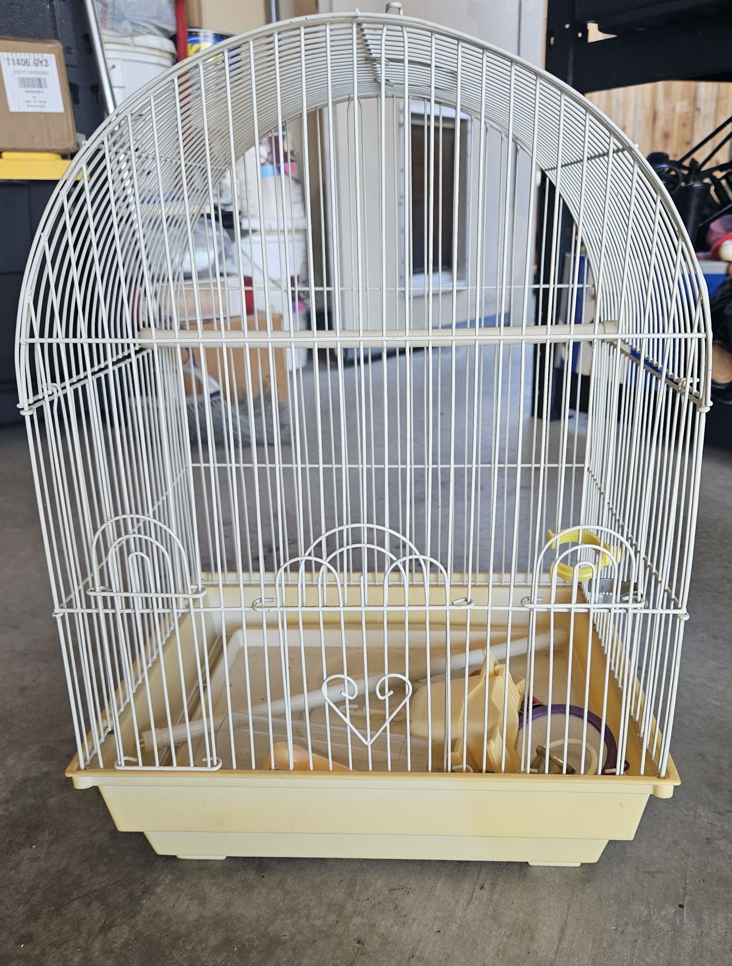 Small bird cage with toys and feeding trays.