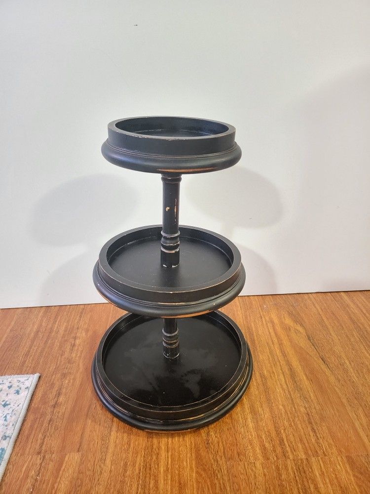 3 tier wooden display Great for fruits, cupcakes, snacks, etc. Has been lightly used, usually just sitting empty on display. Some minor paint chipped (see pics) but most of the "scratches" are actually supposed to be there. It's meant to have a rustic vintage vibe. Please see pics for dimensions