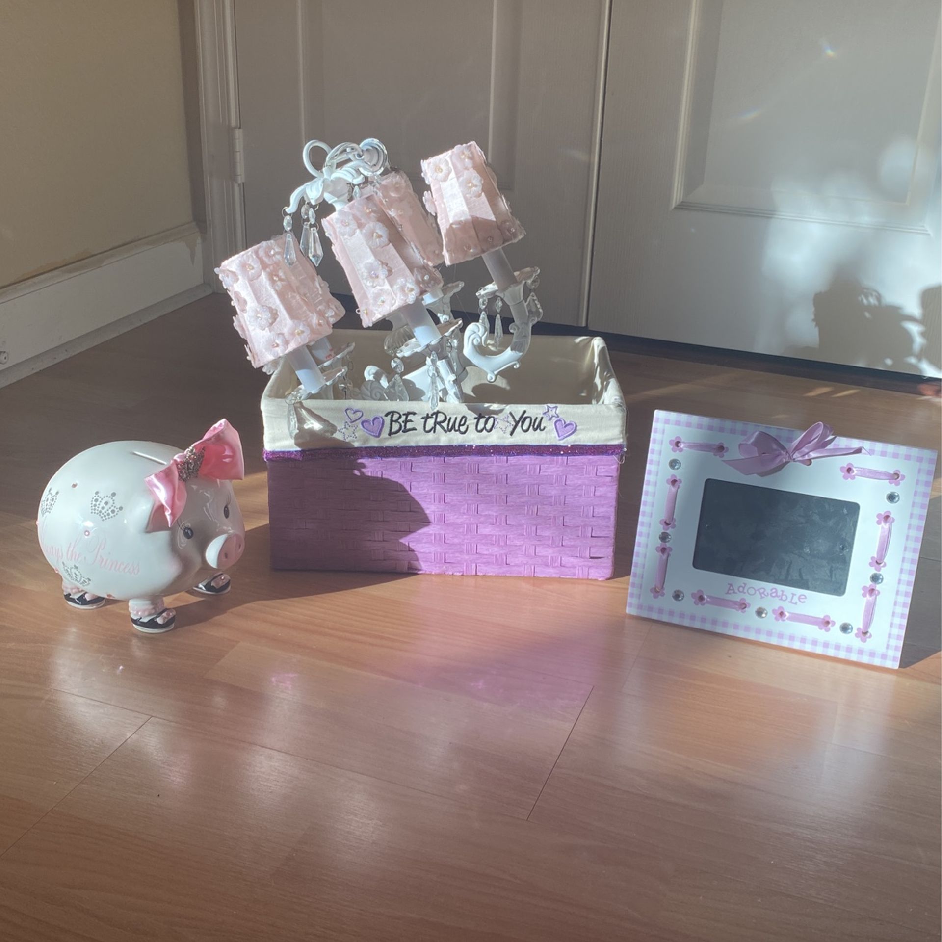 Little girls Crystal chandelier, Picture Frame , Basket, and piggy bank