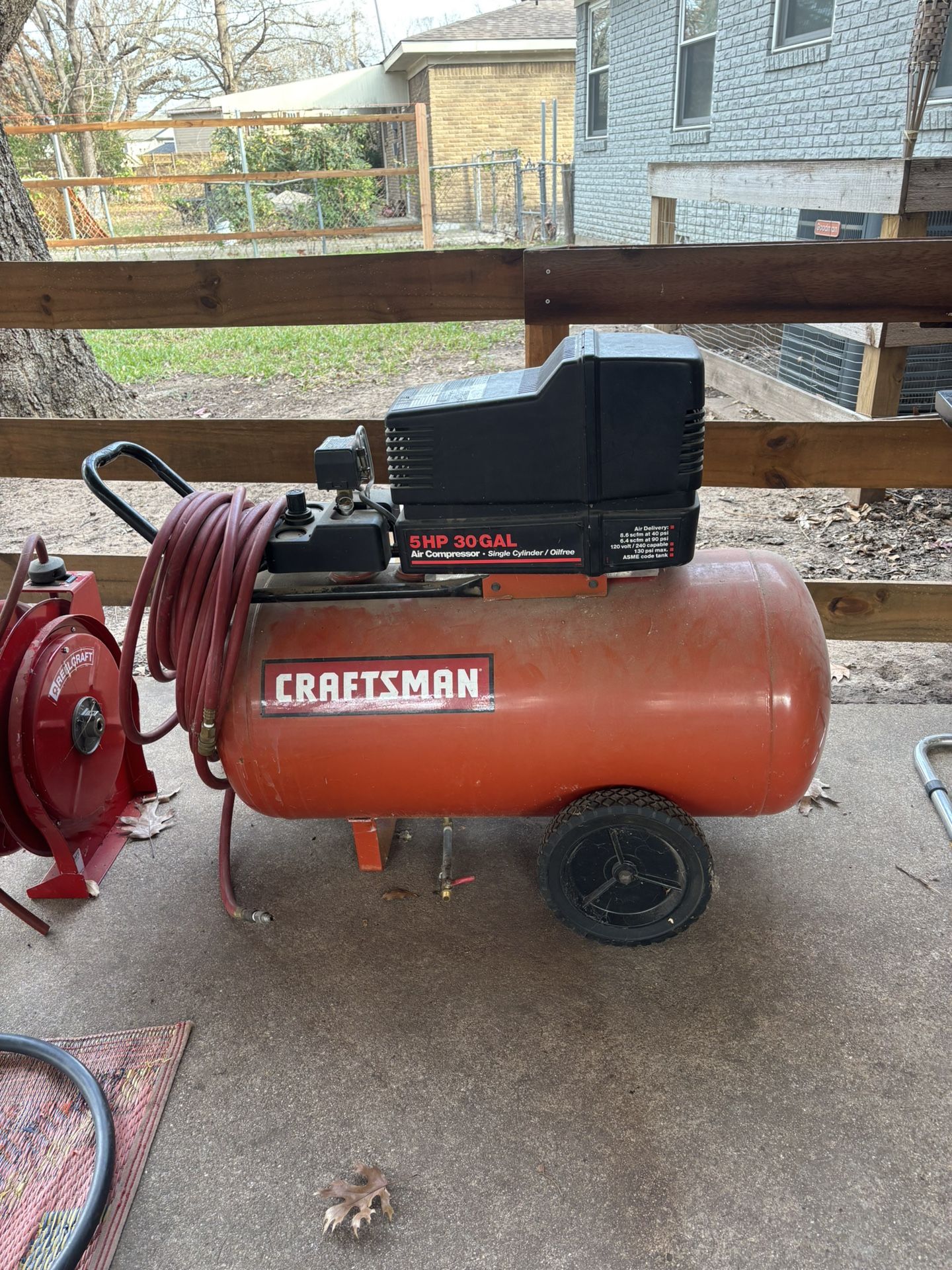 Craftsman air compressor in good working condition. Comes with about 100 feet of air hose and 1 air hose reel with hose attached. Hose reel will need male and female fittings to connect air line.