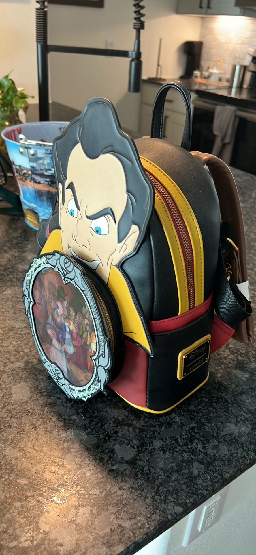 Loungefly of the Beauty and the Beast villain, Gaston. Also has a ventricular image of Belle and Beast on the front of the bag.