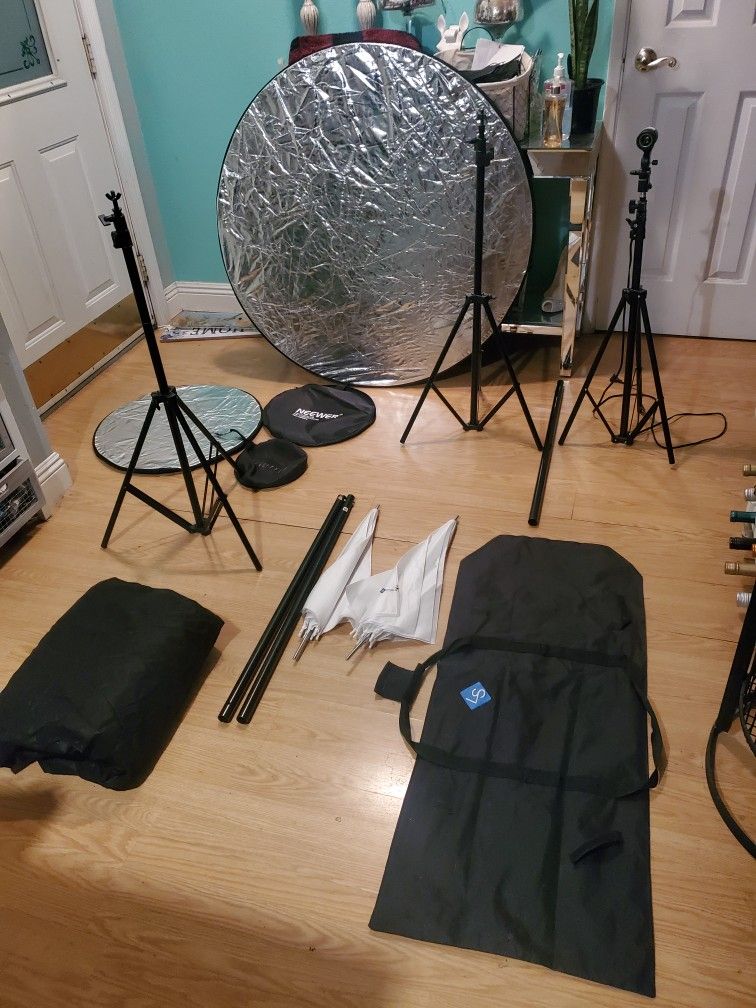 Photography Lighting Kit....2 Umbrellas, 3 Stands, 2 Light Reflectors 2 Back Droos Carrying Case..Great Condition!