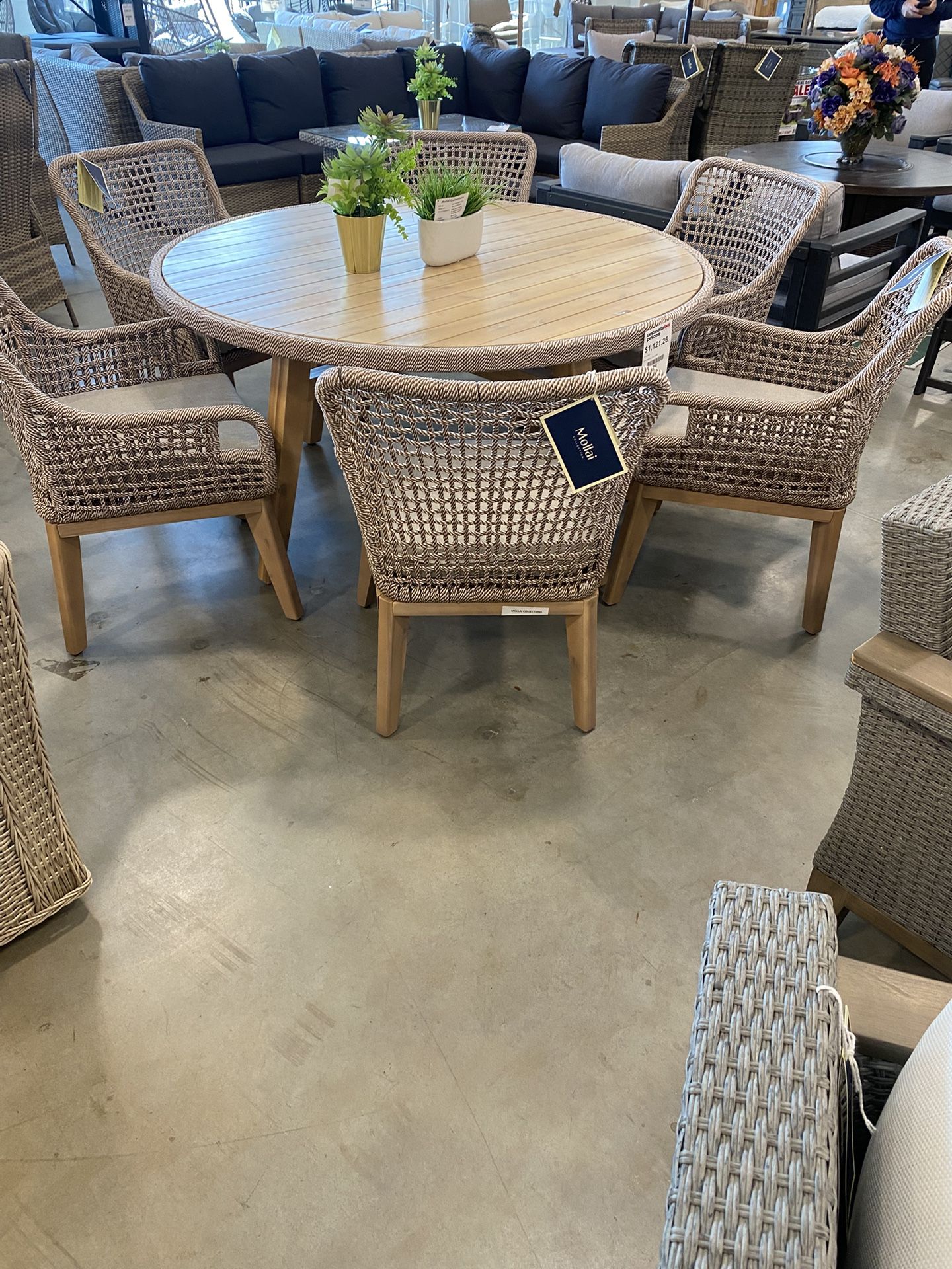 Seven piece patio dining room set, includes: round patio table Wood Top 60“ x 60“ , six arm chairs sold as a set only, Memorial Day sale price.