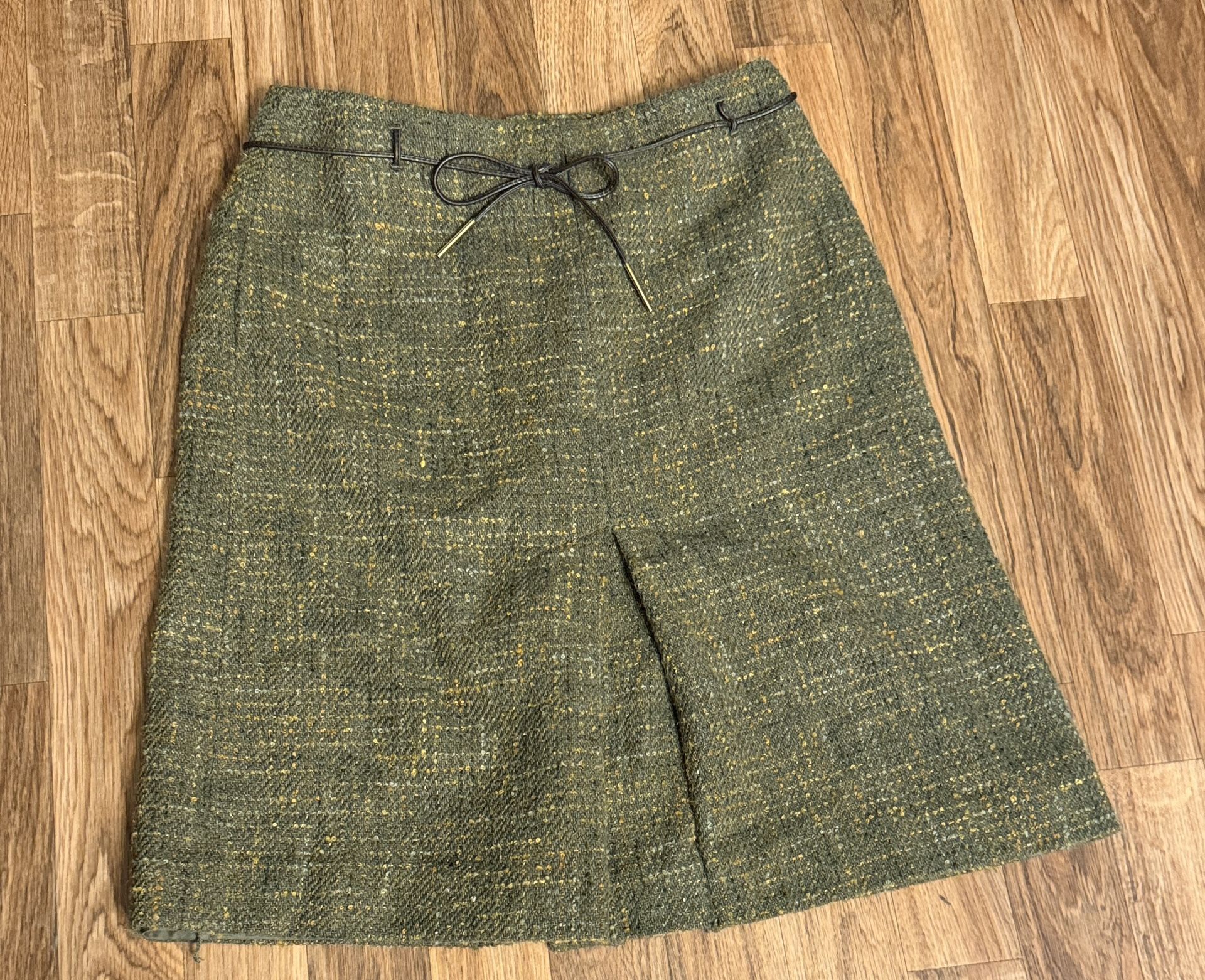 Elegant green tweed skirt with A-line shape. Features a stylish front slit and detachable belt Size 2 Condition: no rips or stains Comes from a pet and smoke free environment