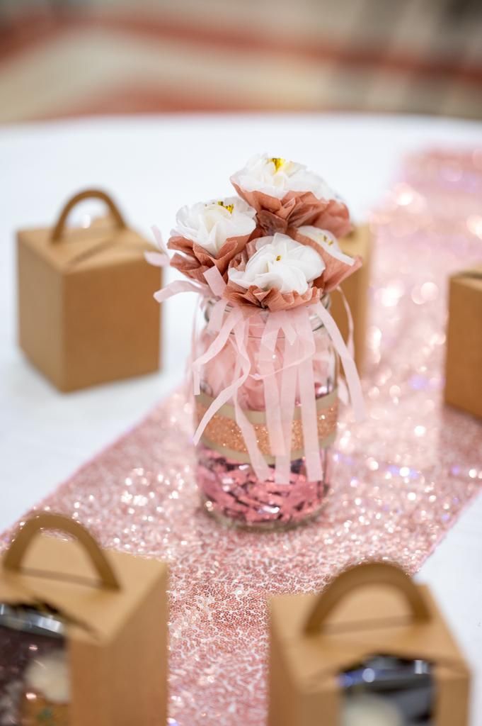 - 10 center piece with rose gold ribbon with peach and white flowers. Each center piece for $10 or 10 for $100 - Diaper cake- $35