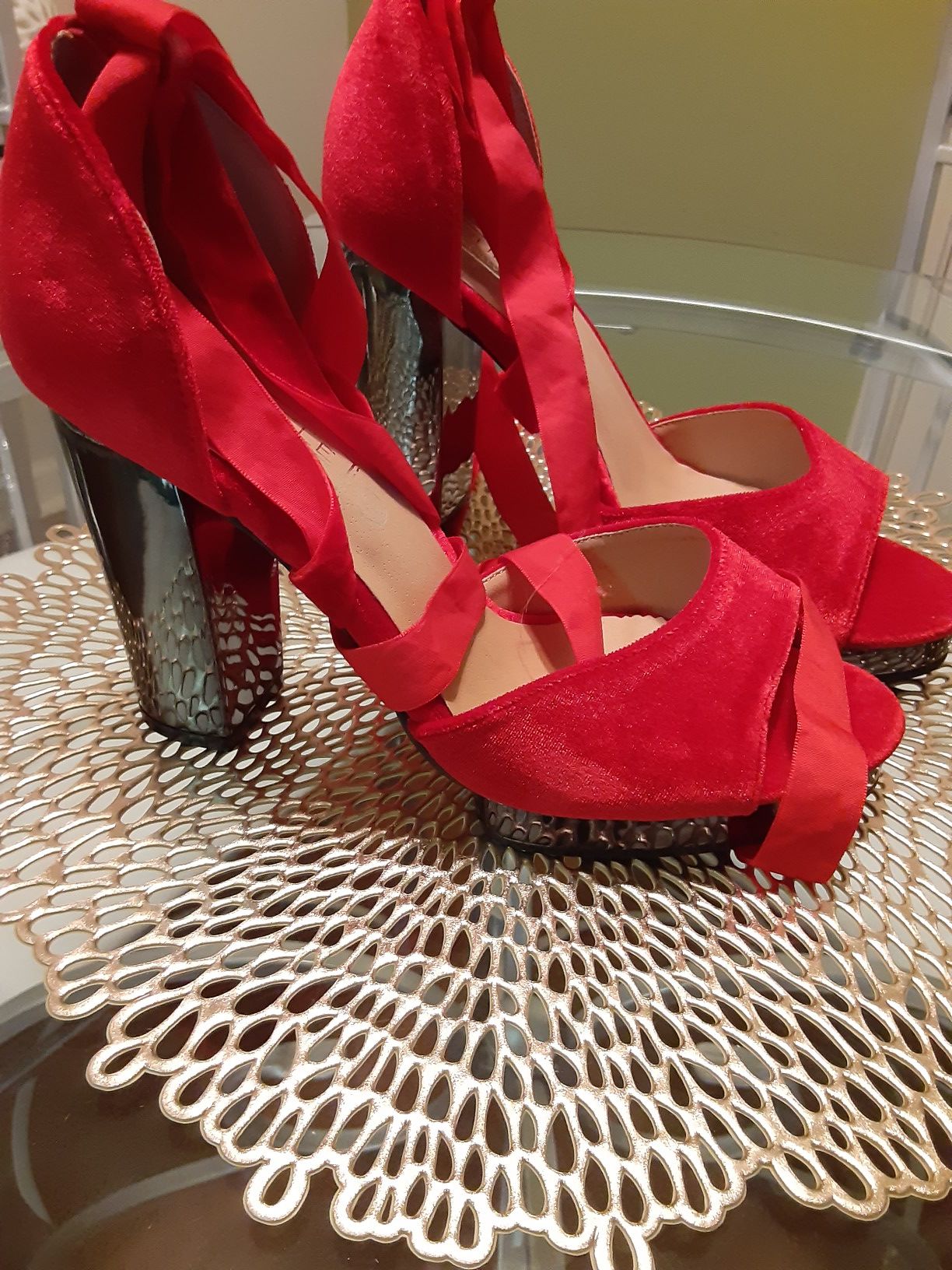Red Velvet, Long ribbon ankle strap, Black mirror heel, Platforms Size 8.5 BRAND NEW HOT🔥