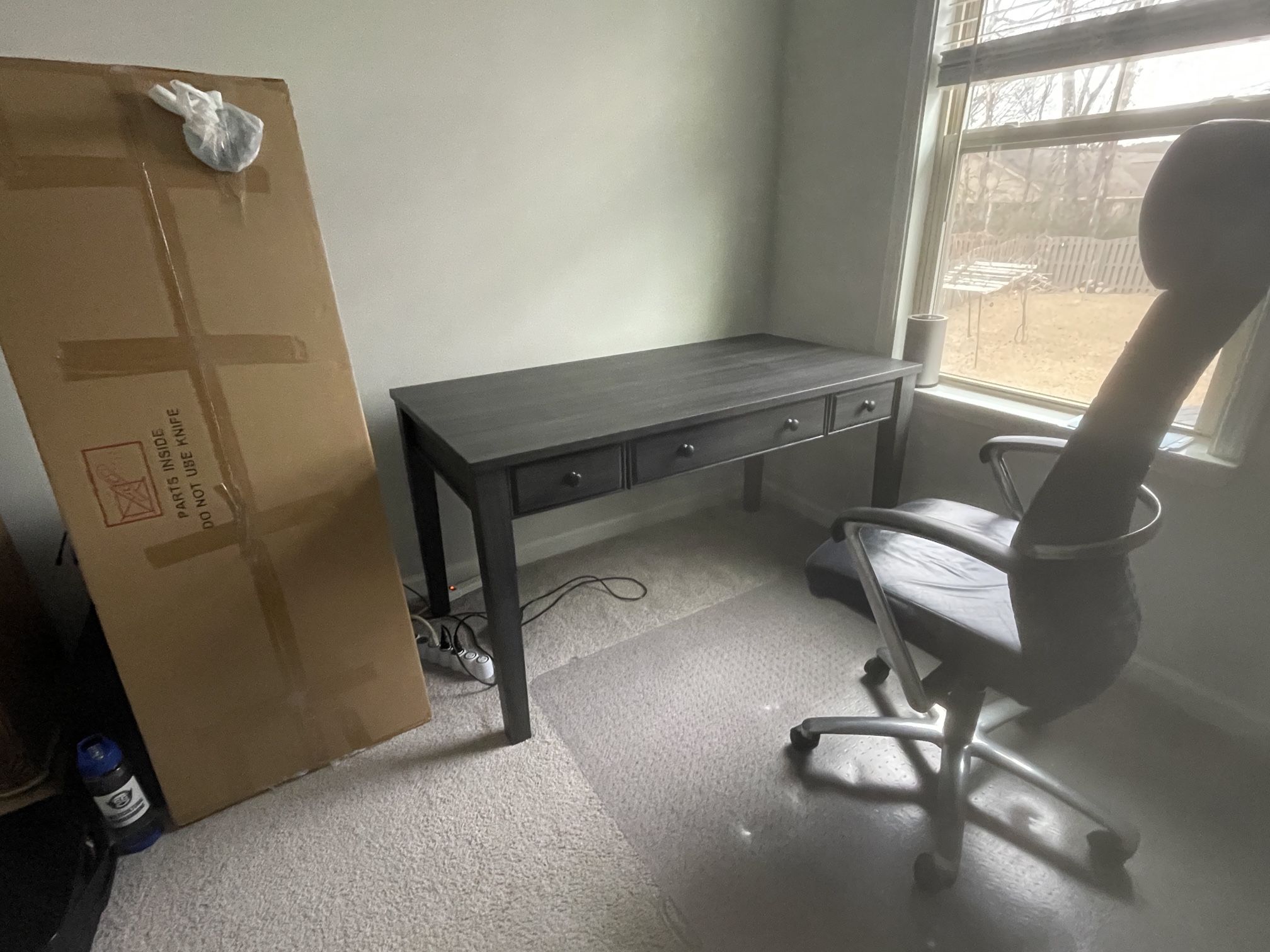 A Whalen Furniture made table/desk, combination of three drawers, two cubbies and a divided shelf offers plenty of storage while the center drawer’s drop-down function is ideal for holding a slide-out keyboard and mouse. Supports up to 200 lbs. Color is dark gray oak. It can be used with or without hutch (the hutch is still in the box, needs to be assembled). Dimensions: 56in W x 28in D x 37in H