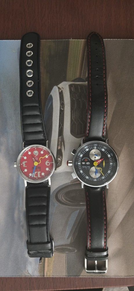 Selling 2 beautiful watches by designer Alain Silberstein, Architecte Horloger pieces These are extremely Limited Edition Pieces in great condition. Both glow in the dark. Fully mechanical. Without the original bands. 40MM powered by LWO 5100 Movement Fully mechanical Keeps time pretty accurate (about a minute difference after 2-3 days) Smooth movement Known as the Cyclope, 35MM Powered by ETA 2824 automatic movement From approximately 1993 Features a distinctive red dial, a yellow squiggly seconds hand, a blue hour hand, and a straight red minute hand. Smooth movement Keeps time pretty accurate, but not perfect. 25-Jewels Swiss Made Let me know if you have any questions, thank you for looking!