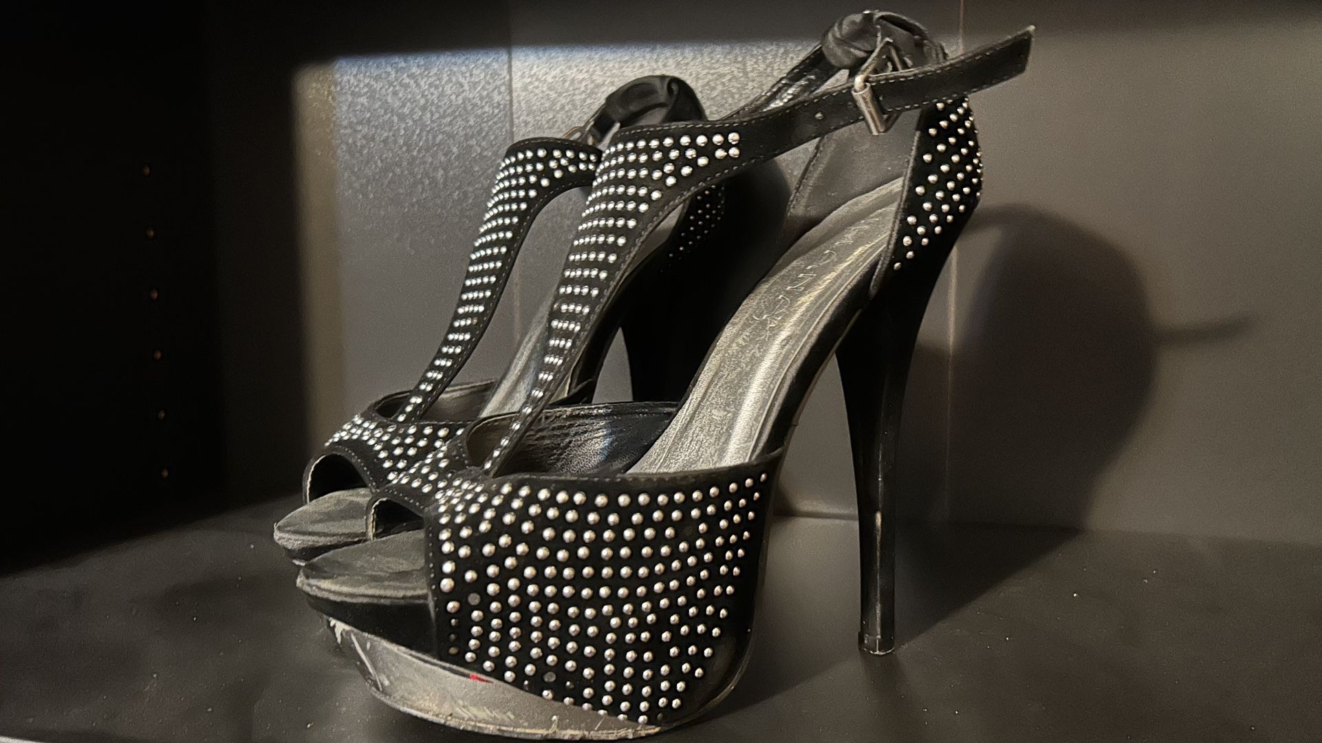 Bring the sparkle in these black rhinestone platform heels in size 11. Featuring a glamorous T-strap design and sky-high heel, these beauties are perfect for dressing up any look. Pre-loved with visible wear, but still a fabulous pair for someone who loves a bold, dressy heel. Sold as-is.