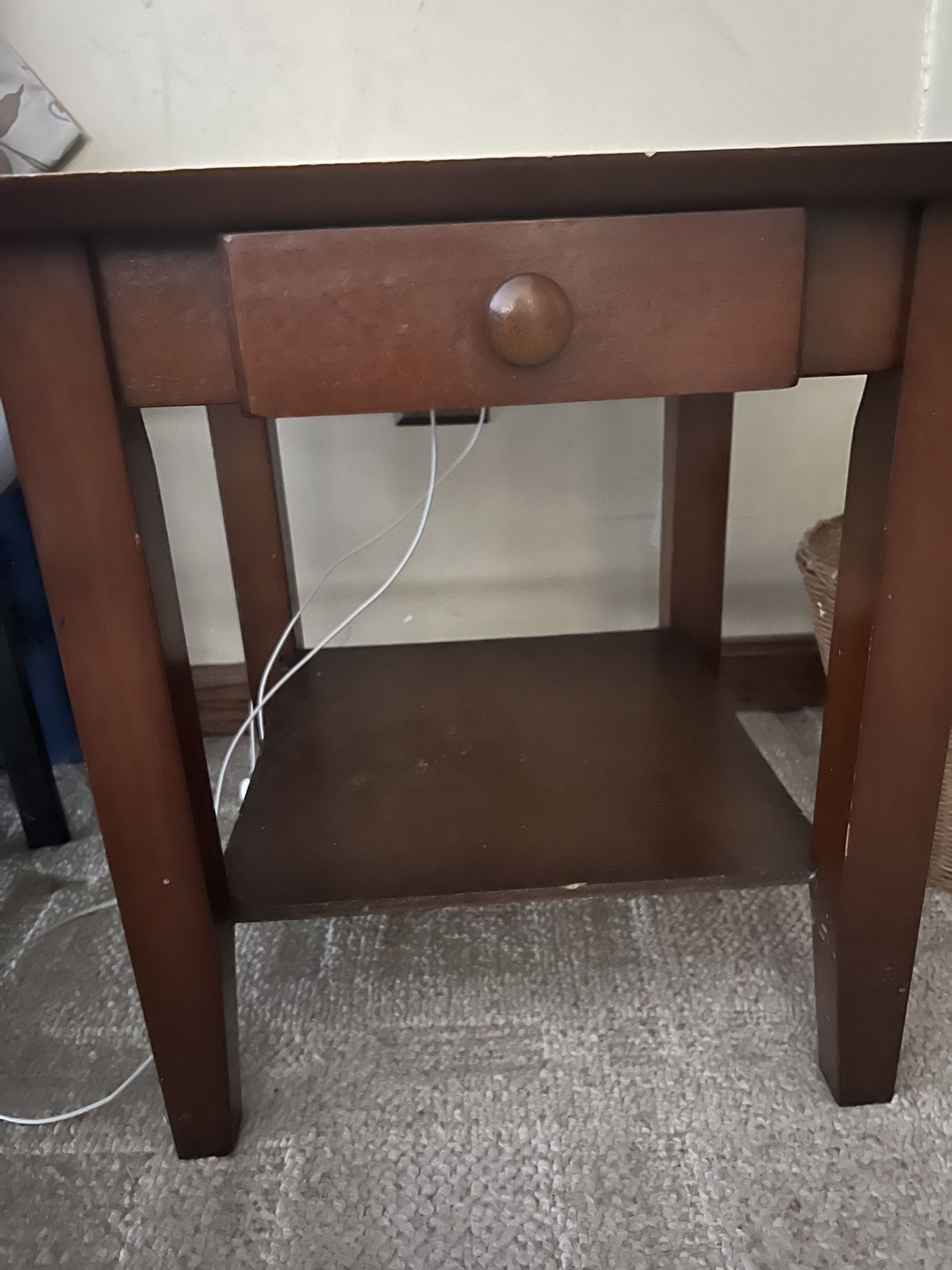 Matching end tables with drawers. Good shape. Price is for set. Matches the table posted separately. Came as a set. Will sell all 3 for $50.
