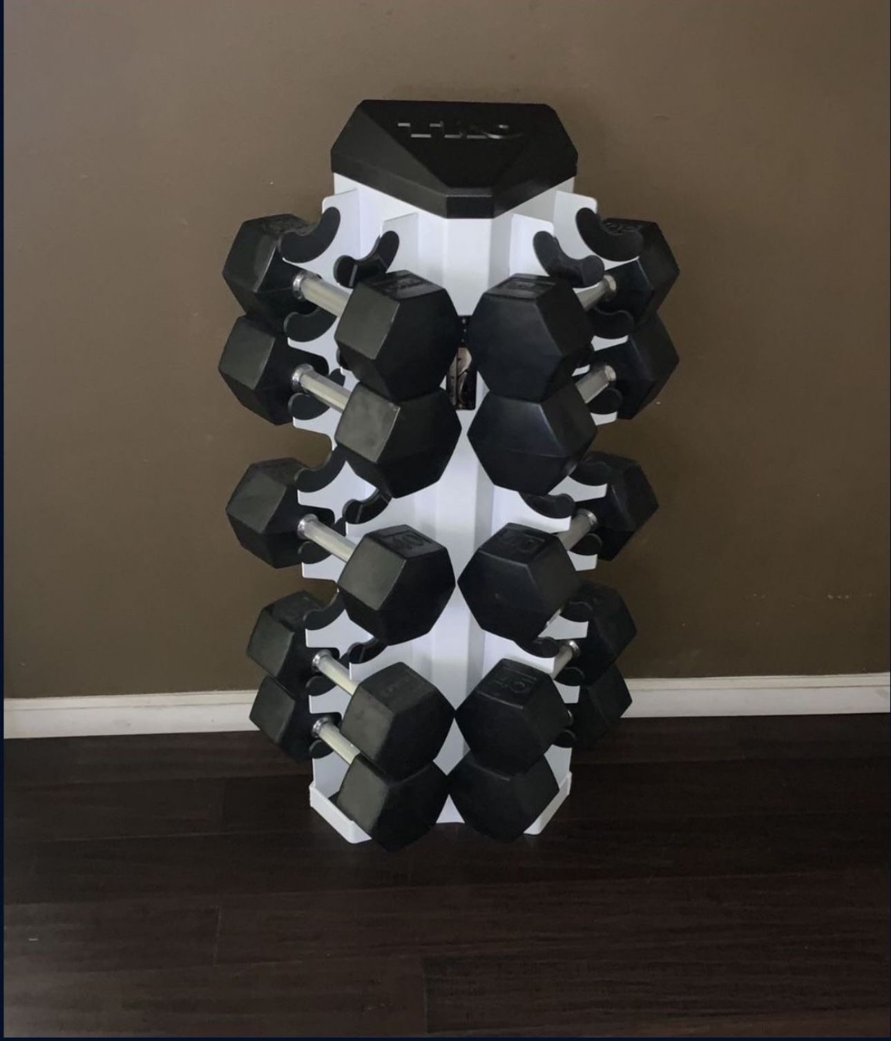 Price: $1,200 OBO (Mint Condition/Like New) Pickup only; no shipping! Beautiful dumbbell set & vertical rack. Only serious inquires; no low ball offers accepted and will not respond; so please don’t waste my time or yours! Description/Specs: Durable rubber is odorless, will not crack or fade & prevents damage to floors & equipment. Patented Tri Grip® handle allows for secure grip. Ideal for home & commercial markets. 2- 30lbs 2- 35lbs 2- 40 lbs 2- 45 lbs 2- 50 lbs (10 pairs of dumbbells) TKO 8 Pair Vertical Dumbbell Rack (FREE) w/ purchase of weights. Dimension Rack Size: 44″ H x 17″ W x 10″ D All sales are final!!!