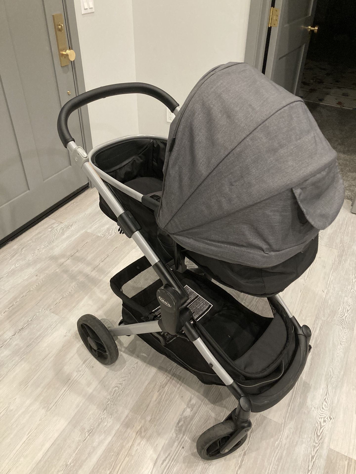 Comes with bassinet attachment, great stroller, almost excellent condition. also transforms into toddler seat, no stains. Does not come with car seat.