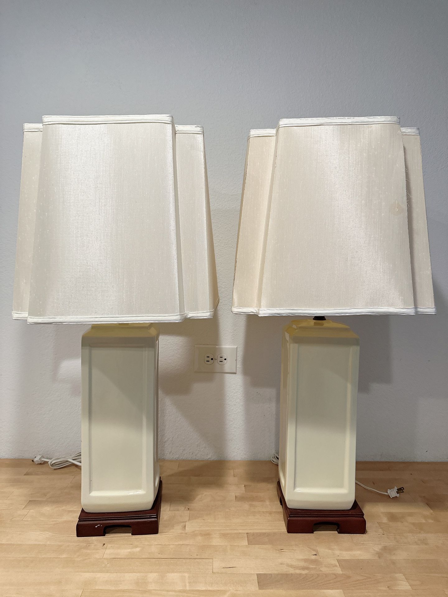 Vintage pair of square column ceramic table lamps with custom lamp shades. Pair is on wood bases. Both in great working condition in great working condition. Measure 32” tall with shade. Shades do show some signs of age. Beautiful design on this pair! Pick up NW Peoria ⠀ see more vintage and secondhand goods on IG at cactushousecollective ⠀