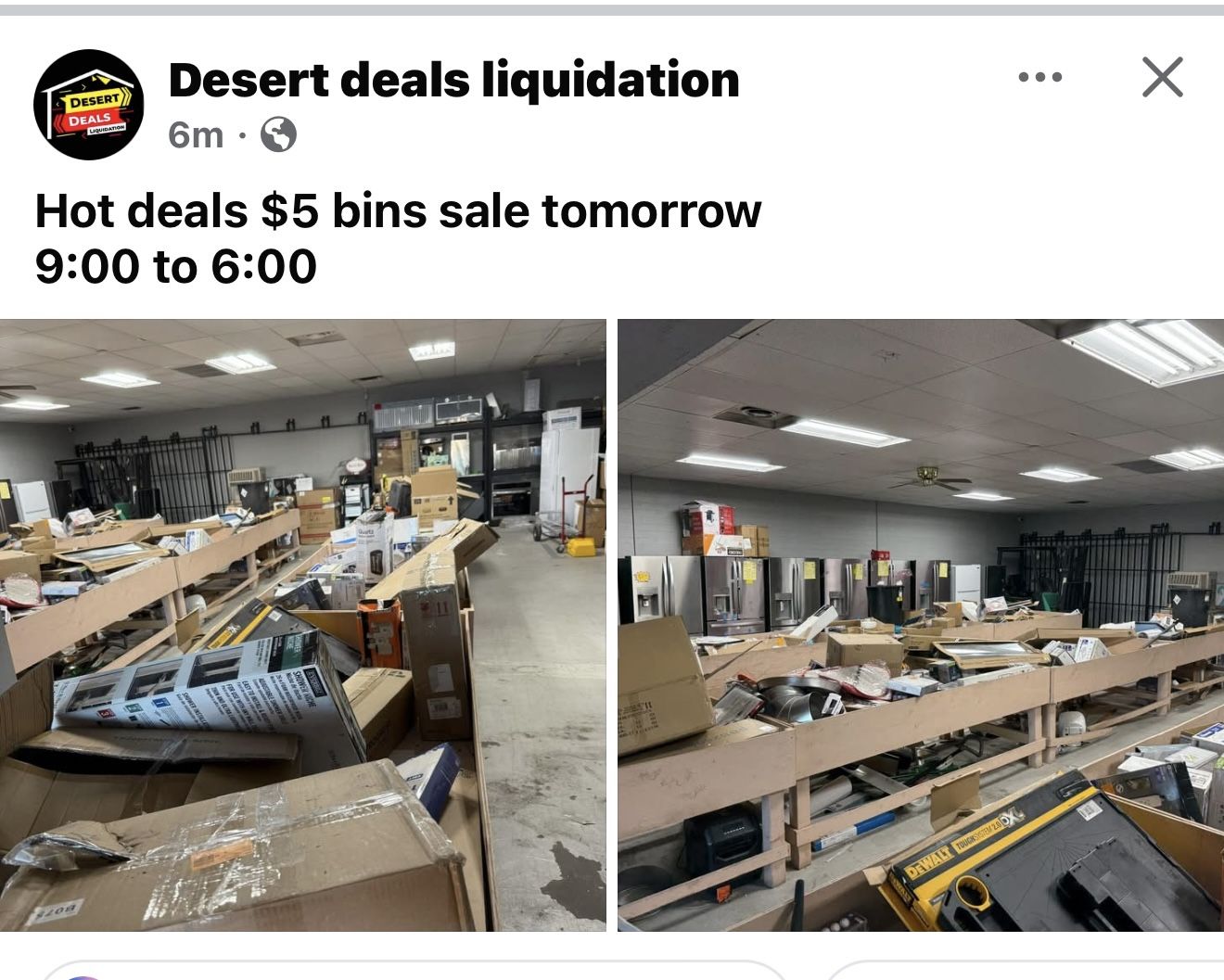 Desert deals liquidation has hot deal Wednesday 03/26 all bins $5 from 9-6 locations 1322 S 4th ave yuma az 85364