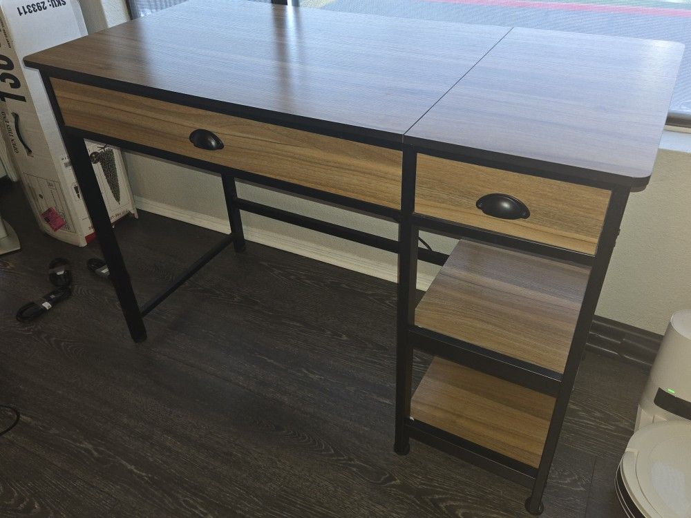 The price is very negotiable or best offer. This computer Desk is used like new. This Desk folds out to standing position as well. I am looking to move and cannot take it with me. I am looking to sell it as soon as possible. Whomever comes to get it first its yours. Someone will need to come get it as I live in a second story apartment. Chair will come with