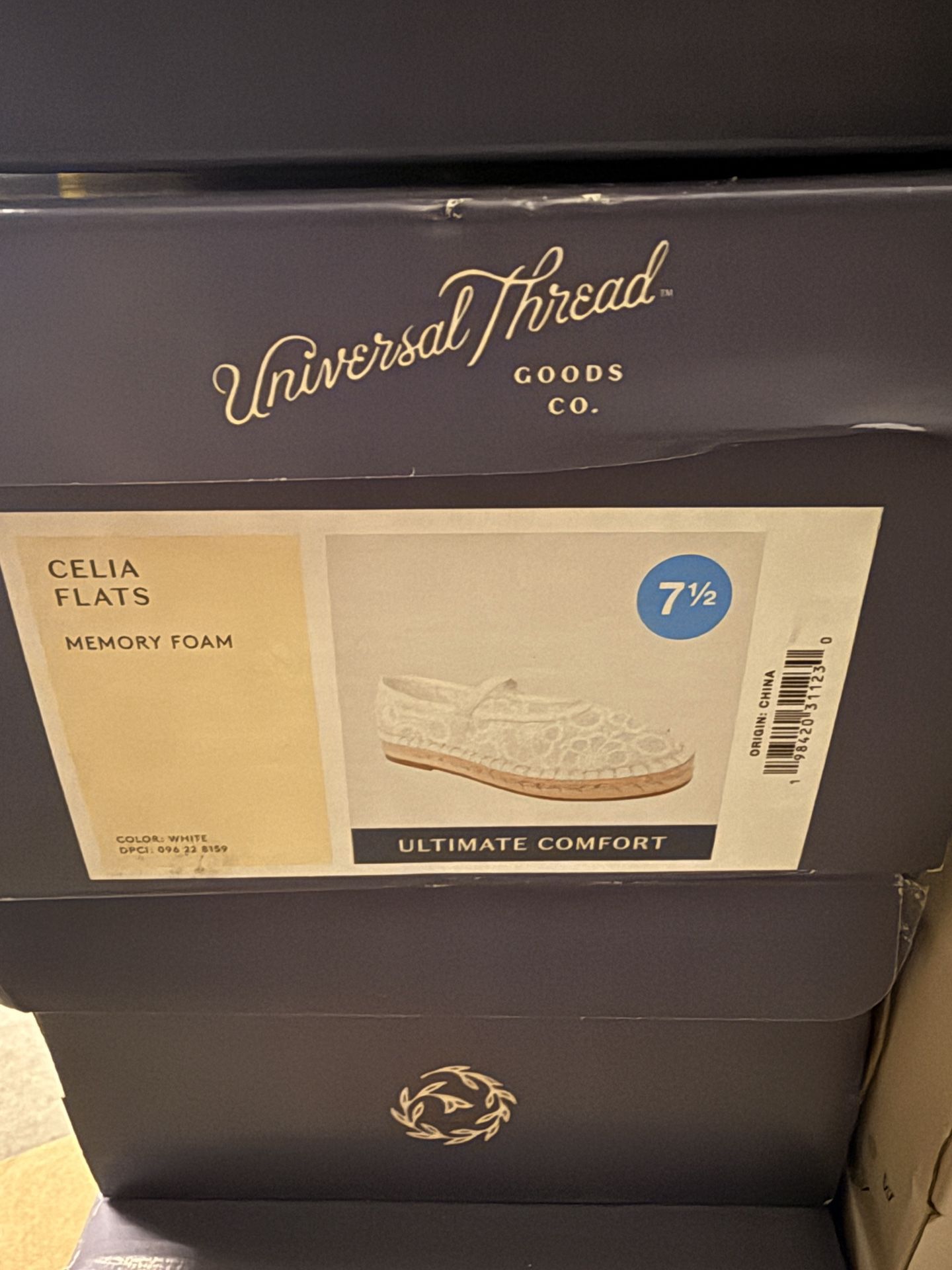 Brand new Universal Thread "Celia" flats. • Size: 7.5 • Color: White Lace / Espadrille bottom. • Features: Memory foam insoles (super comfy). • Condition: Brand new in box. • Perfect summer shoes!
