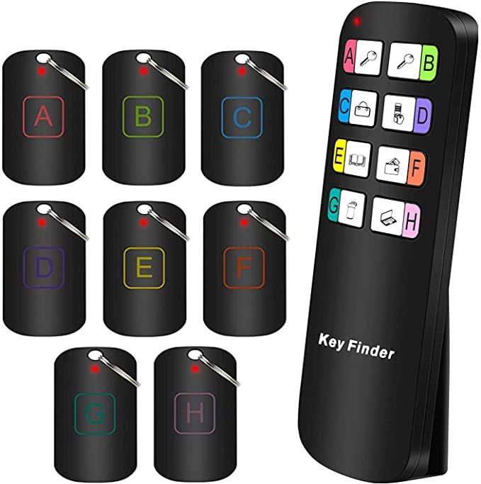 【8 RECEIVERS&EASY TO USE ITEM FINDER】- Attach the receives to any 8 items such as keys, tile,mobile phones, pets, car,wallet, luggage, bags etc with the key rings or double sided adhesive tape, and simply press the Color buttons on the transmitter to locate them. The receiver sounds/beeps/flashes will lead you to find your lost item. Specially suited to older people and the one who always forgot things. wallet locator tracker,remote locator,finder for remote control,wallet and key tracker. 【POWERFUL AND LONG DISTNACE RANGE KEY FINDERS】- Beeping sound of item tracker up to 100dB, remote finder is loud enough for you to locate items. Wireless control range up to 130ft in open area! You can use the key tracker around the house or in your garden. Radio frequency can penetrate through walls, floors, cushions, leather, etc to help find your item up to 130ft away. So you can find your items easily at most of corners in your house. Frequency of Wireless Key RF Locator: 433.92MHz. In addition to sending 75-100dB of sound through the receiver to help you find the items, you can see clearly where your lost items are even in the dark. phone finder for the deaf