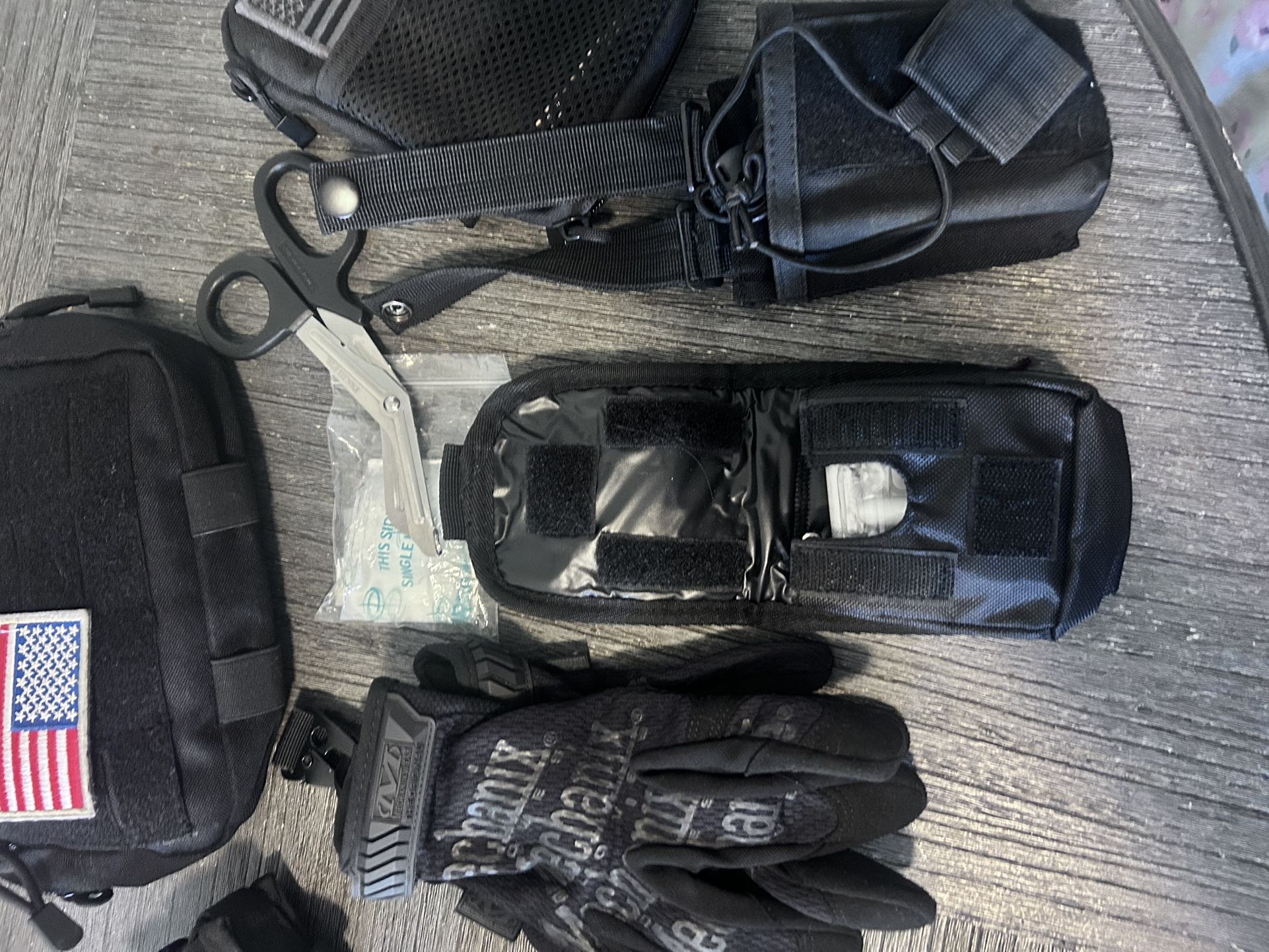 Two tactical vest pouches, one flashlight holder, one handcuff case one radio holder and a Narcan holder also come with trauma shearers