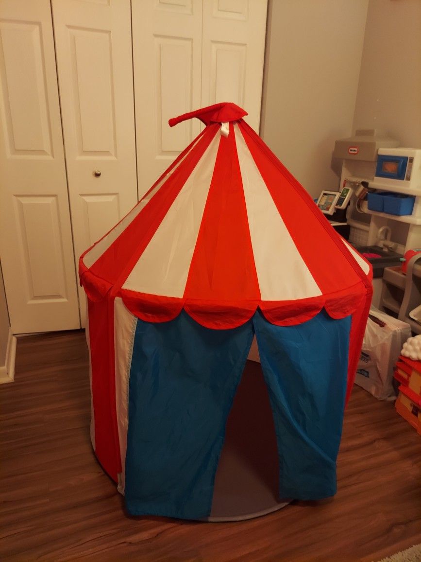 Red, White and Blue tent Easy to fold up Lightweight Measurements are in the last picture Excellent Condition