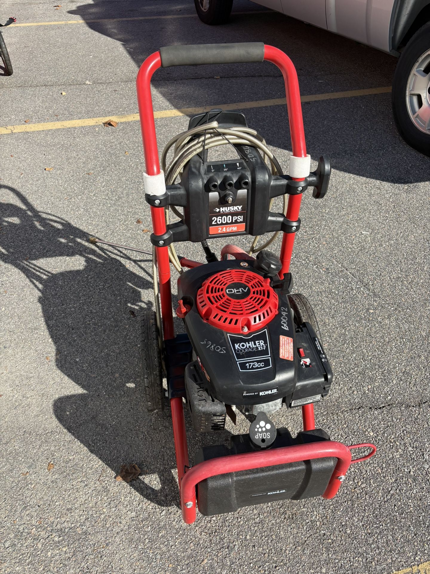 Great working condition, 173cc engine — starts easily and delivers strong pressure. Selling because it's no longer needed. 2600 PSI / 2.4 GPM Gas powered (no cords, much stronger than electric) Kohler engine Standard quick-connect fittings