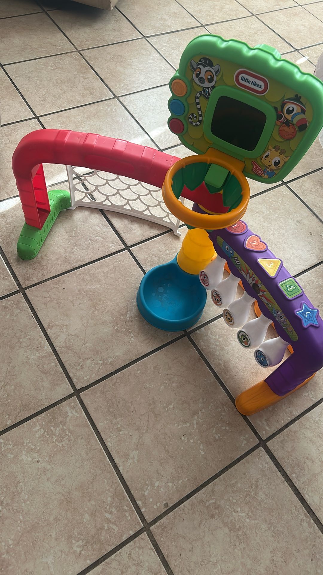 Basketball, soccer, and bowling toy all in 1. In good working condition.