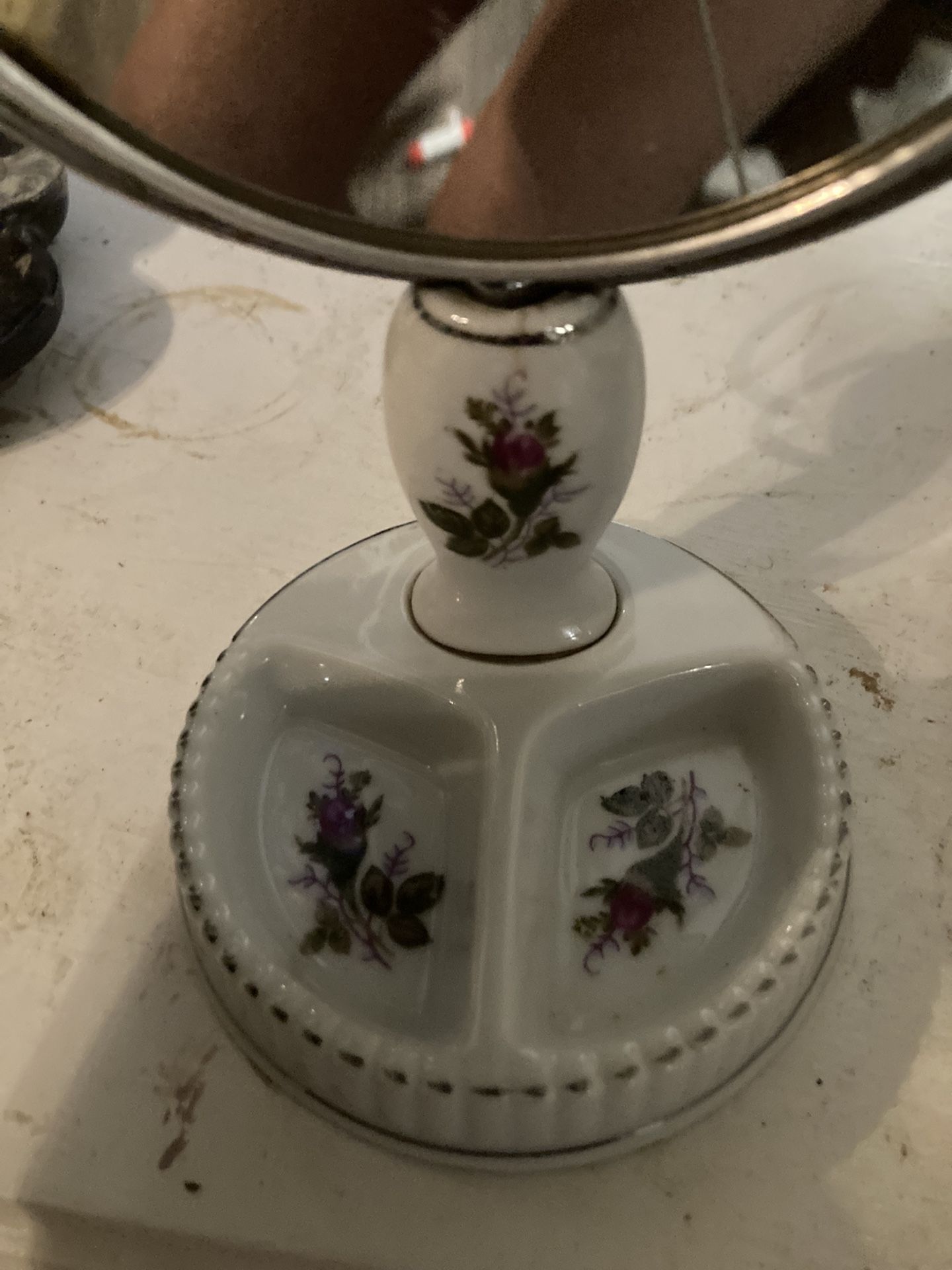 The stand is white porcelain w/ a thistle design that has 2 places for small jewelry 1950s-early 2860s 4” x 6.74” h great condition