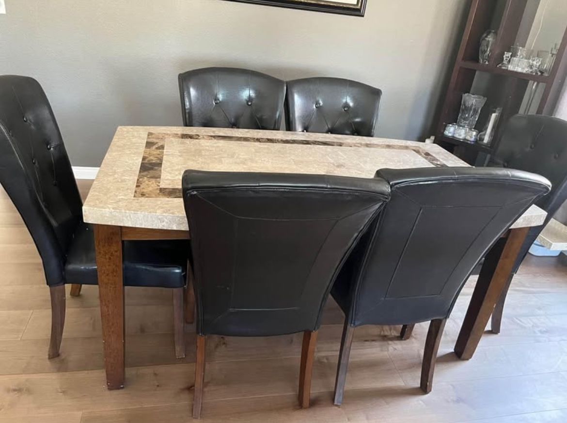 Real Marble Table. Comes with 6 chairs. Few Tiny scratches and dents but nothing big or noticeable. The chairs have small scratches on them. If you want more pictures or have any questions, let me know. Also it’s a heavy table solid marble!