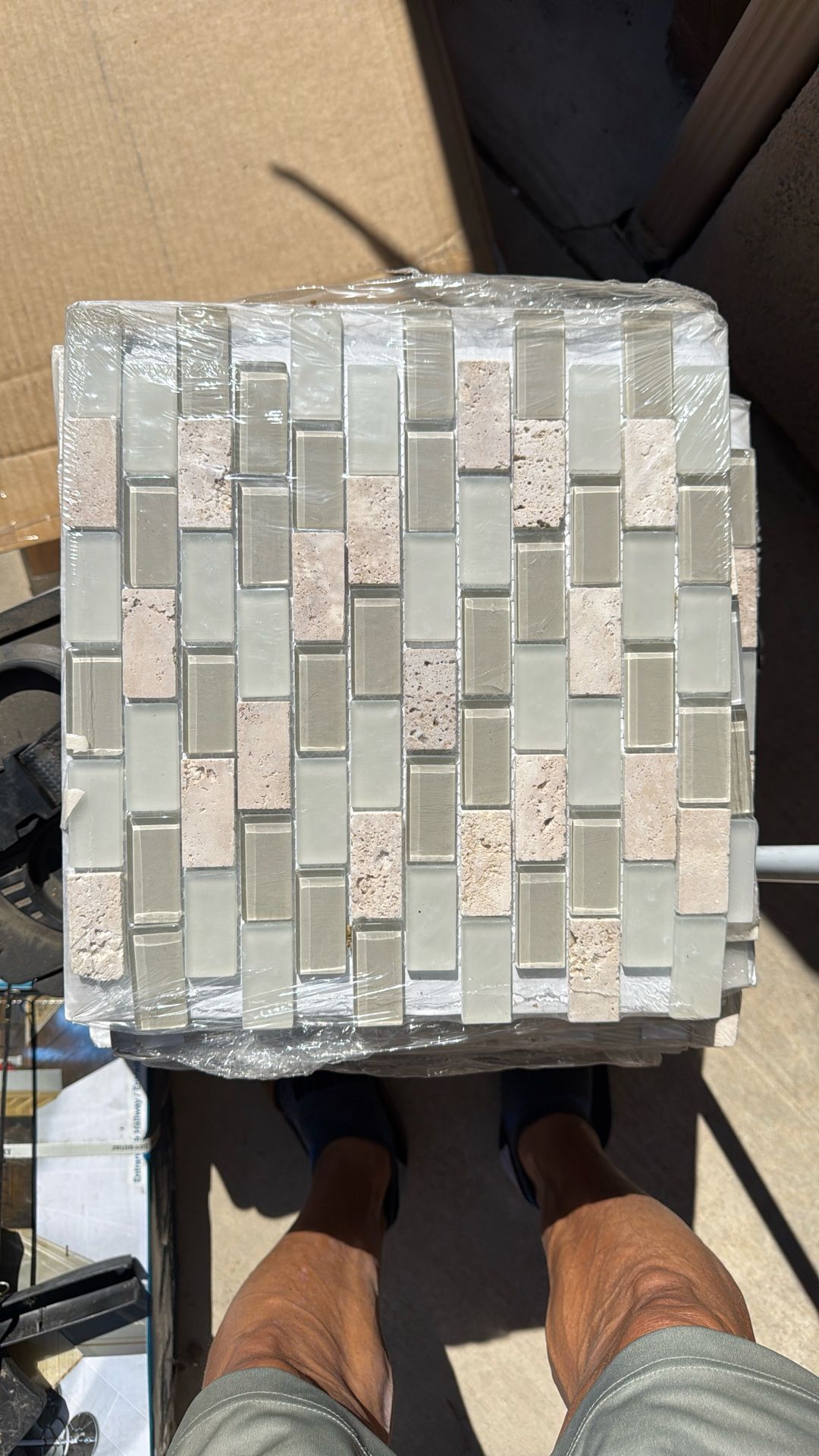 1. 25 Glass sheets of 12 x 12 backsplash/shower tile Beautiful tile for any kitchen or shower project 2. 2 boxes of light beige tile.