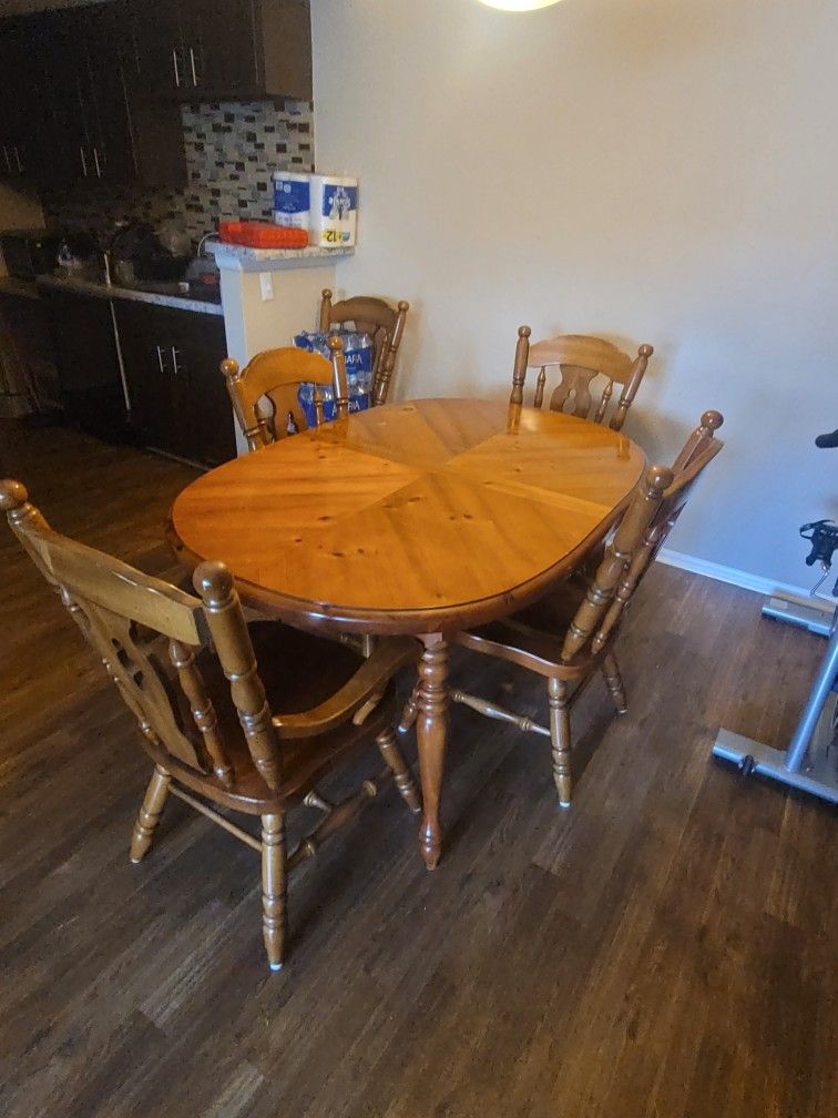 9ft yellow oak table with 5 chairs. Comes with x2 fish ext.