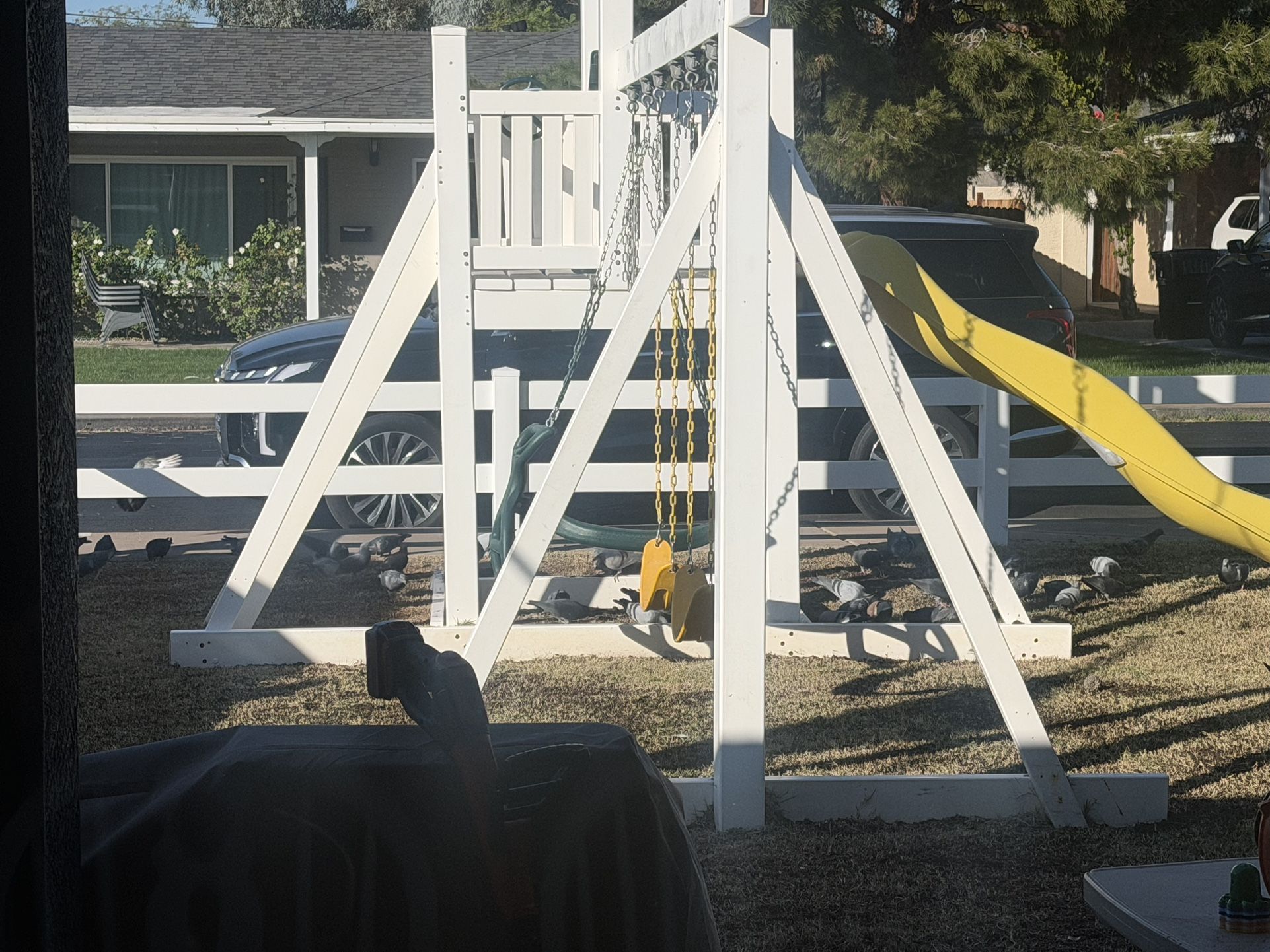 Looking to sell our vinyl play-set. We moved and can't take this with us. It includes three swings one double swing, a play phone and play steering wheel. I have the pieces for the awning it just isn't up. You will need to move it.