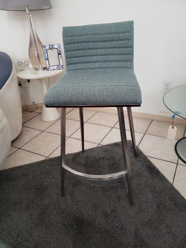 Showroom Sample by LumiSource. Barstool with brushed nickel metal legs/bent wood frame, and fabric seat/back. Swivel 26" seat height, overall 35" h x 15"w x 25.5" d