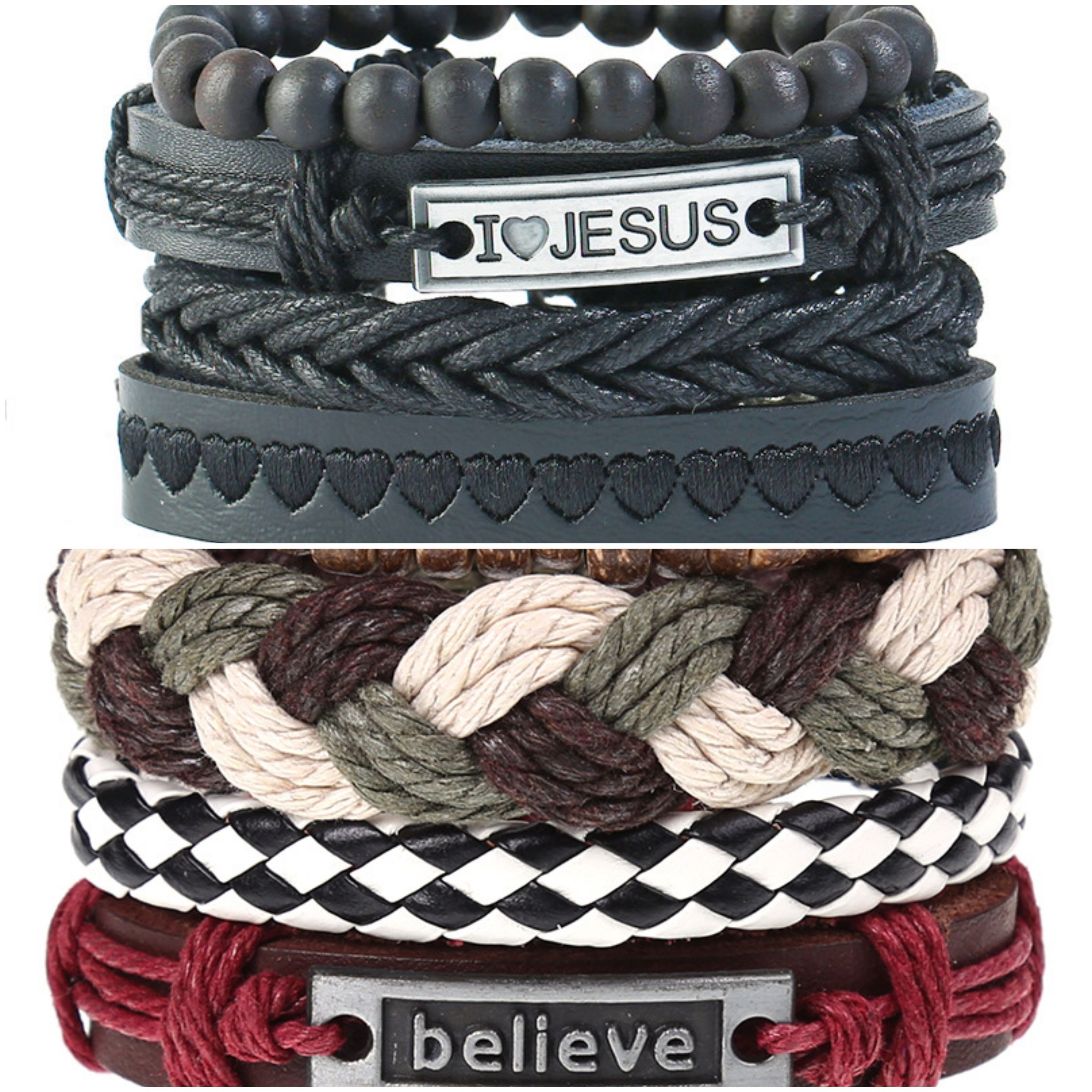 2 x Set Adjust. Size up to 9.5inc Leather Bracelet, (BI__Jesus-Believe_1)