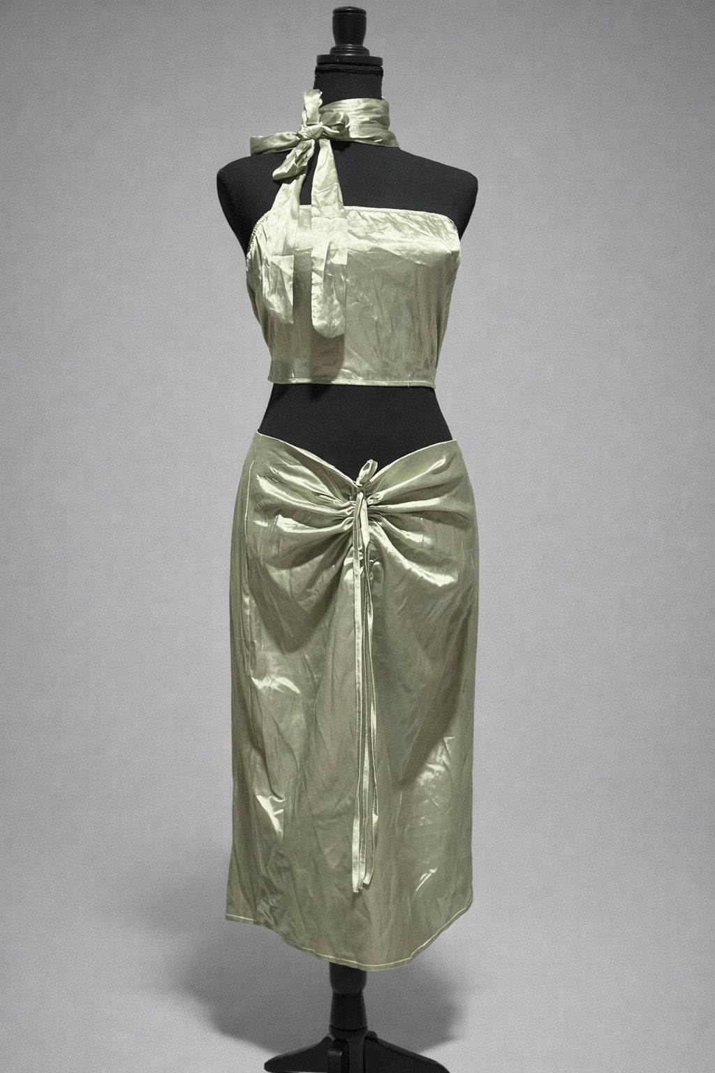 Sage Green Satin 2pc Set Halter Crop Top Ruched Midi Skirt